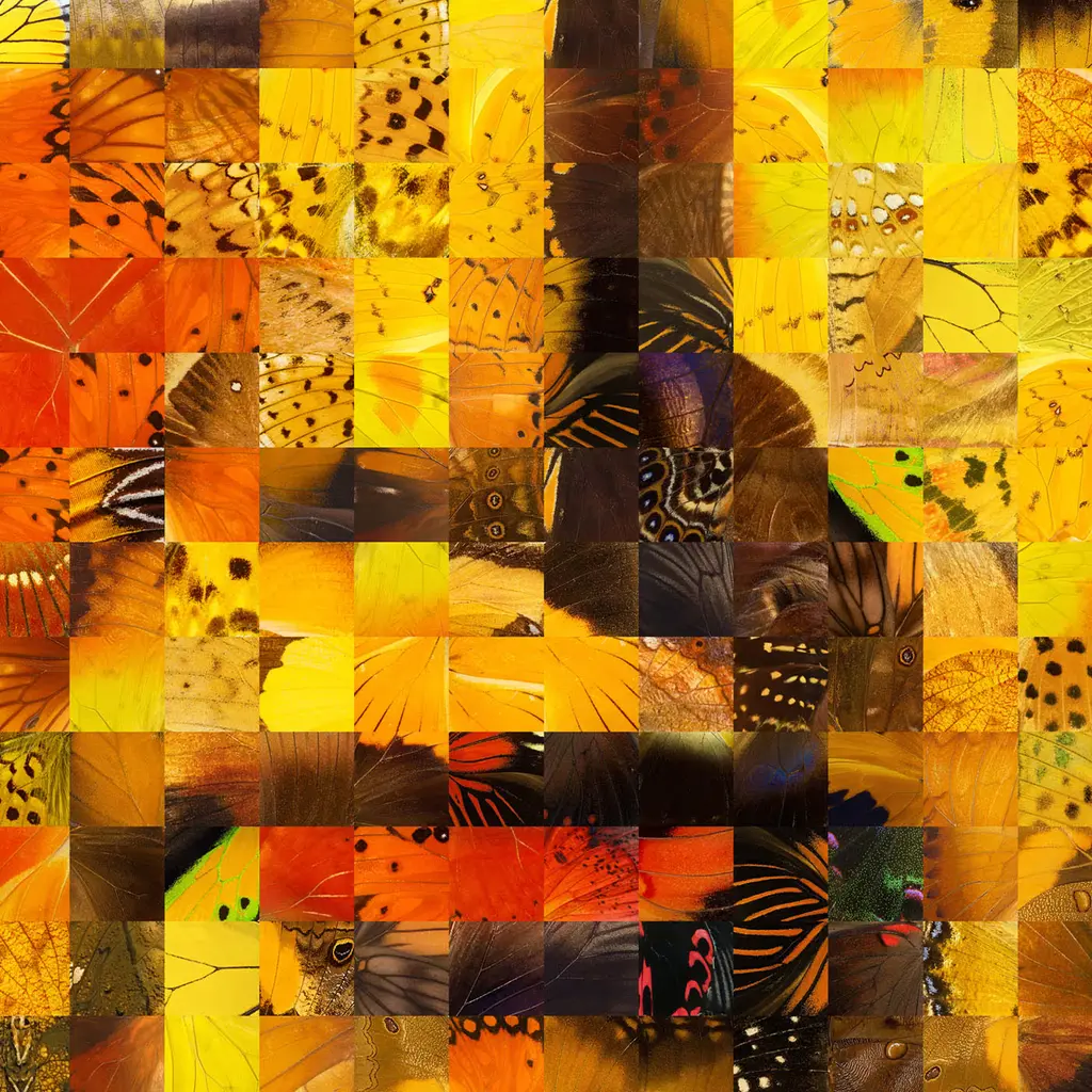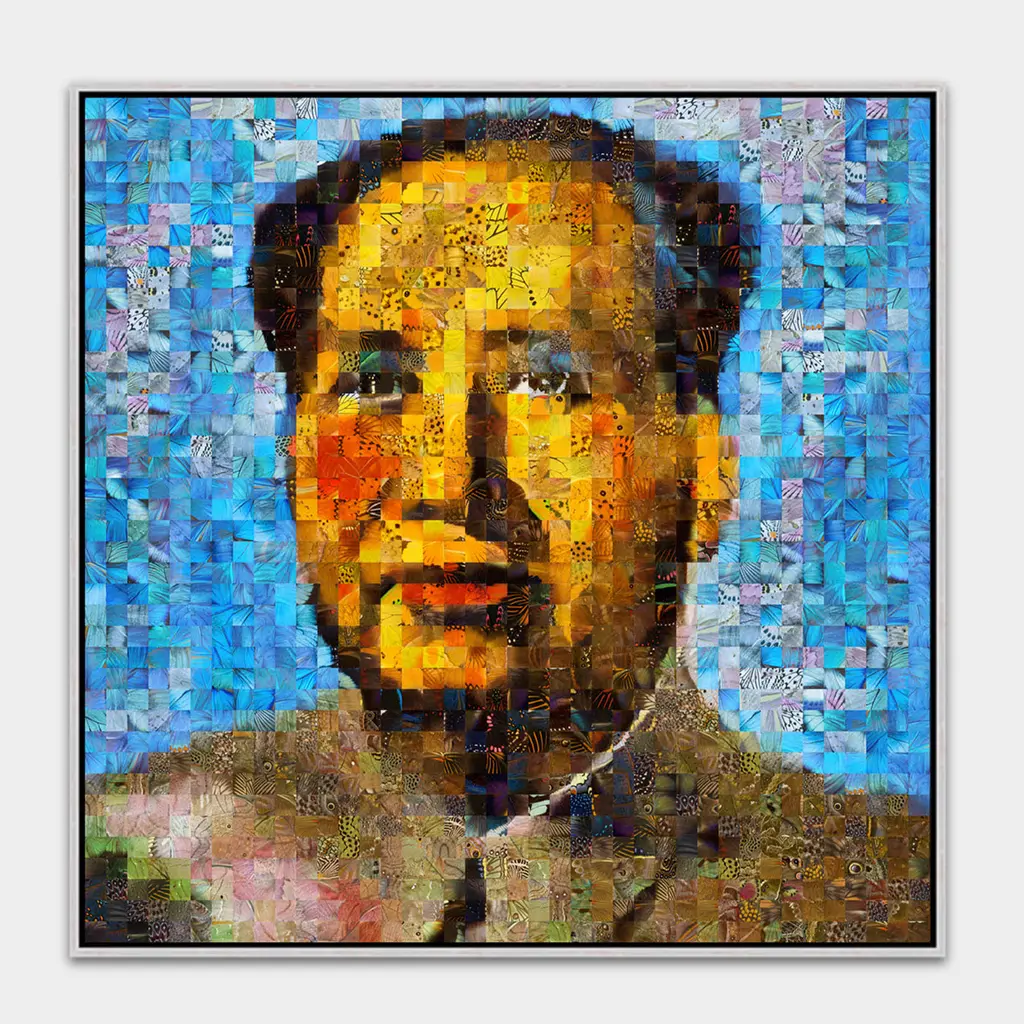 Mao is composed of 1600 photographic tiles of butterfly wings details that have been used to elaborate this work provided with a double certificate of authenticity and uniqueness countersigned by the artist and blockchain registered. The work can be ordered with a handcrafted wood frame. Revisiting Andy Warhol’s Mao Zedong, 2020, metal sublimation print, chromaluxe HD aluminum, 120×120 cm, Ed. of 3. Please ask the Concierge service for further information