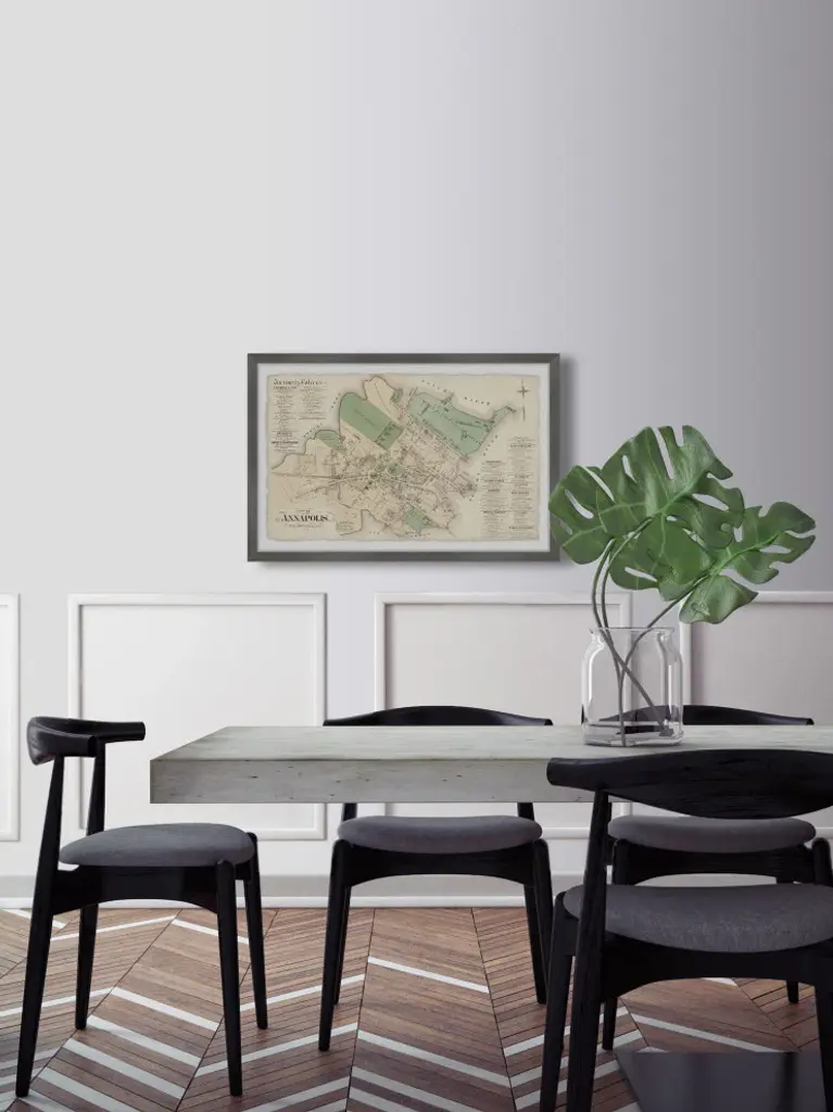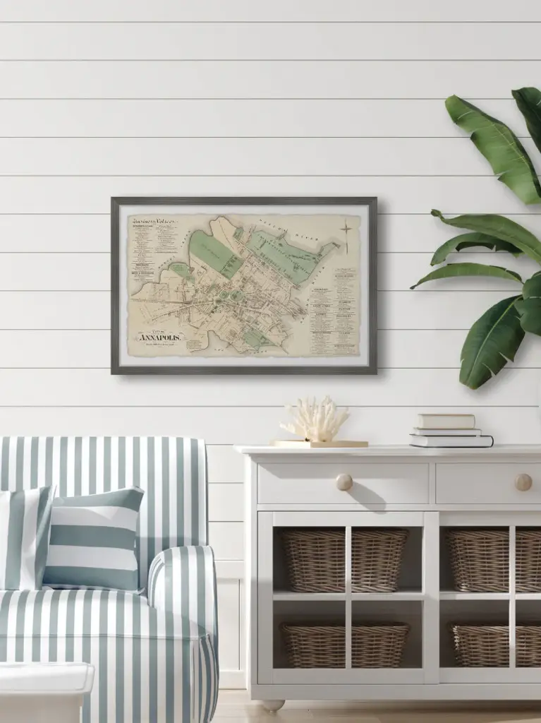 This muted map gives a fascinating take on the geography of Annapolis, Maryland. Proudly printed in the USA, this piece is printed on high quality archive paper and professionally hand-framed. With wall-mounting hooks included, this artful accent is ready to hang up as soon as it reaches your front door.- Top quality Gicle print on high resolution Archive Paper- Hand cut deckled edges- High quality durable non-warping frame- Finished under shatter resistant plexiglass- Arrives ready to hang- Includes a certificate of authenticity- Printed in the USA