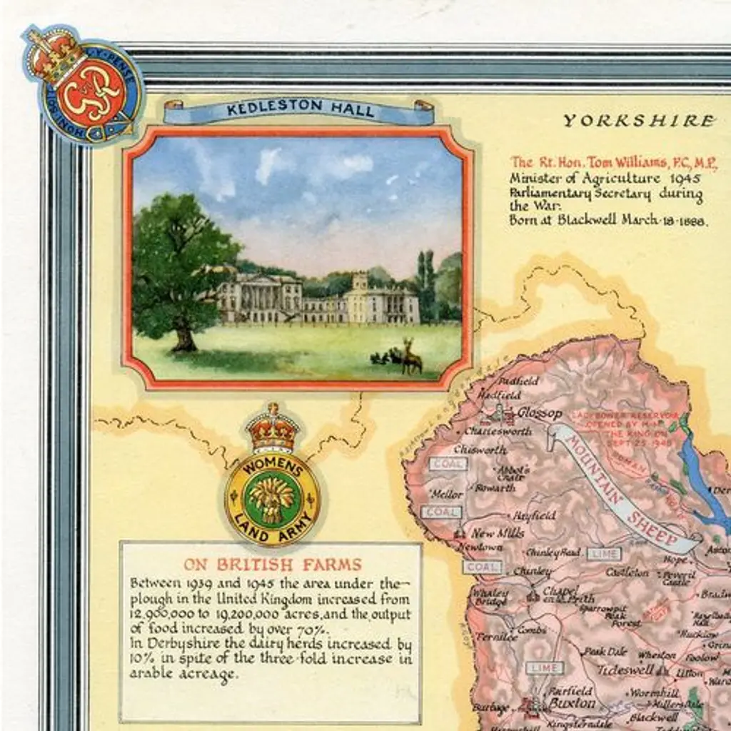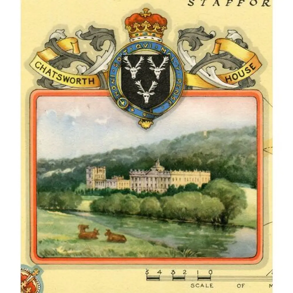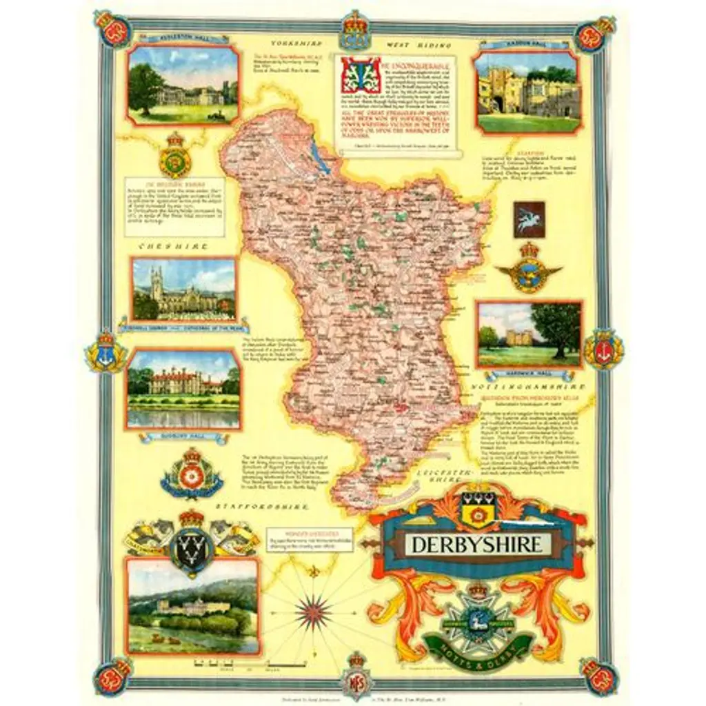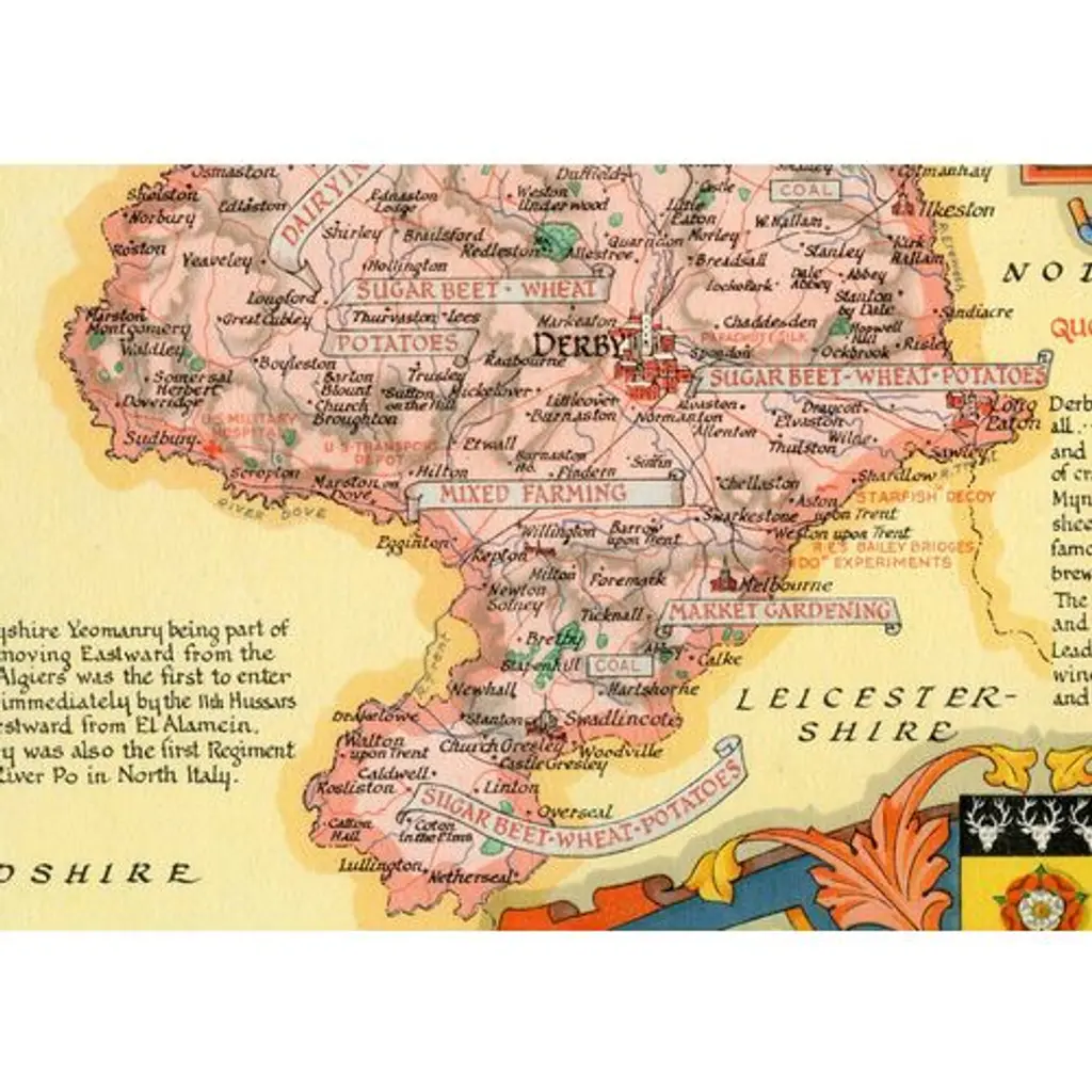 Original lithograph map of Derbyshire, a county in the East Midlands of England, circa 1945. Designed by the British cartographer Ernest Clegg (1876-1954). This large and colorful map of the county shows cities, topography, and commerce by region. Clegg surrounds the county map with detailed illustrations of major points of interest and historical anecdotes. Includes a certificate with additional information.