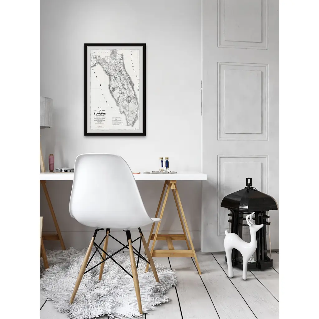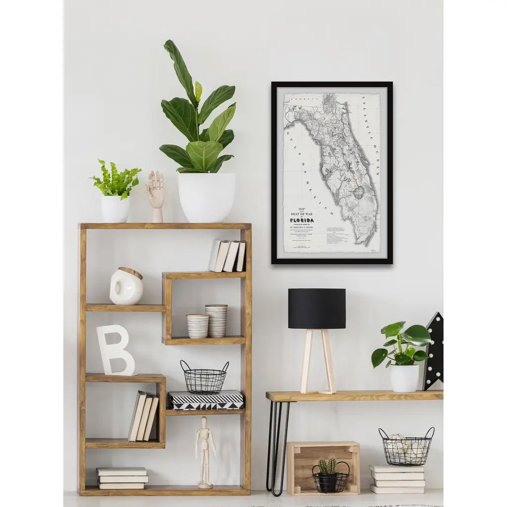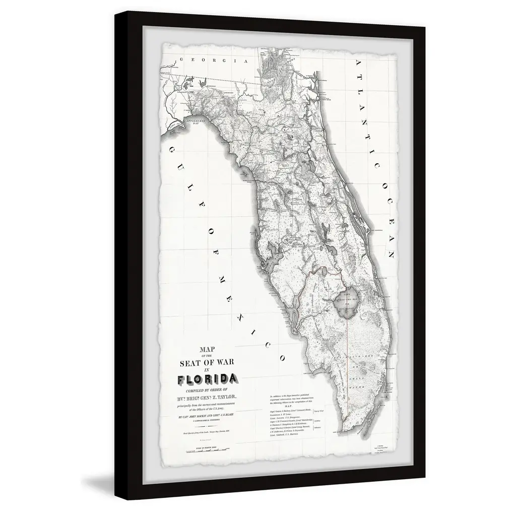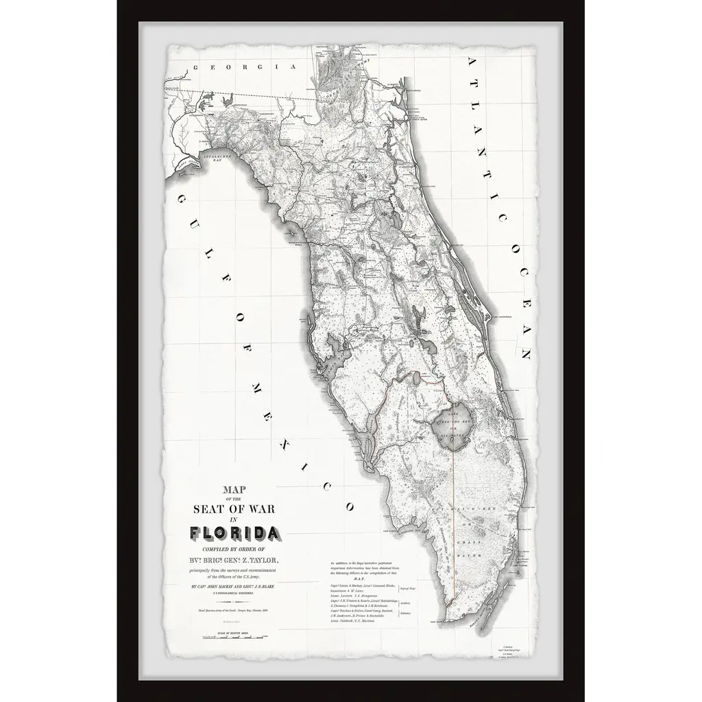 This map of the Seat of War in Florida brings together the state and the Gulf of Mexico to showcase the state's long coastline and bordering waters. This piece is printed on high quality archive paper and professionally hand-framed. With wall-mounting hooks included, this artful accent is ready to hang up as soon as it reaches your front door. • Top quality Giclee print on high resolution Archive Paper • Hand cut deckled edges • High quality durable non-warping frame • Finished under shatter resistant plexiglass • Arrives ready to hang • Includes a certificate of authenticity • Printed in the USA