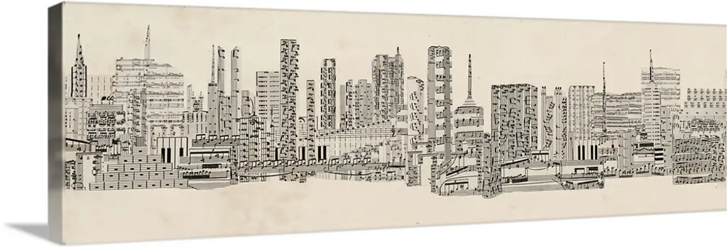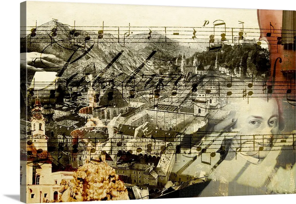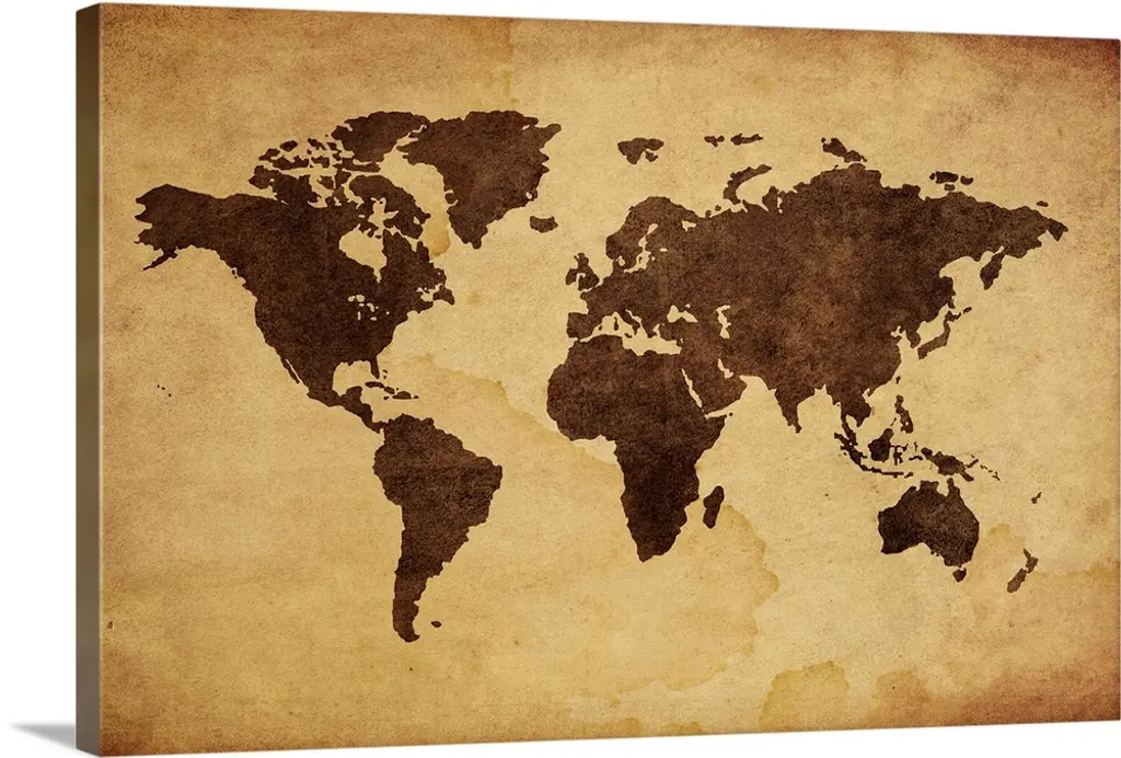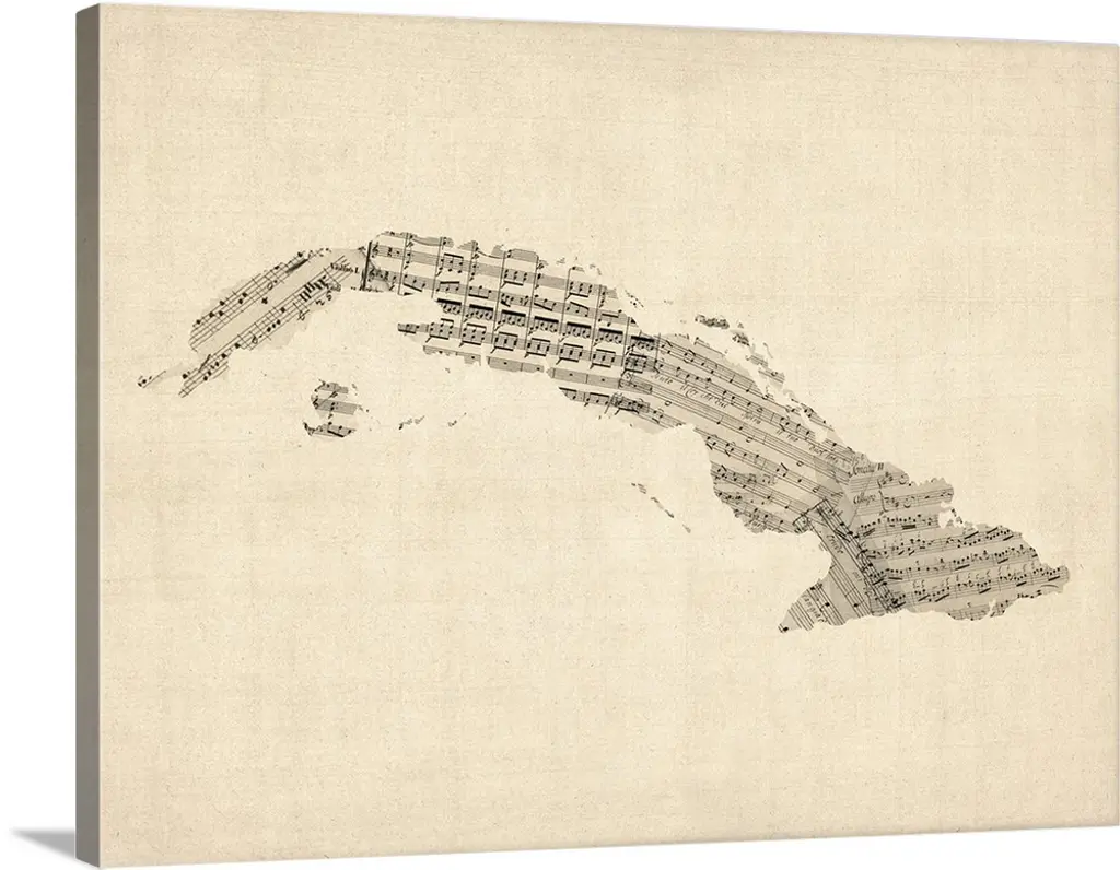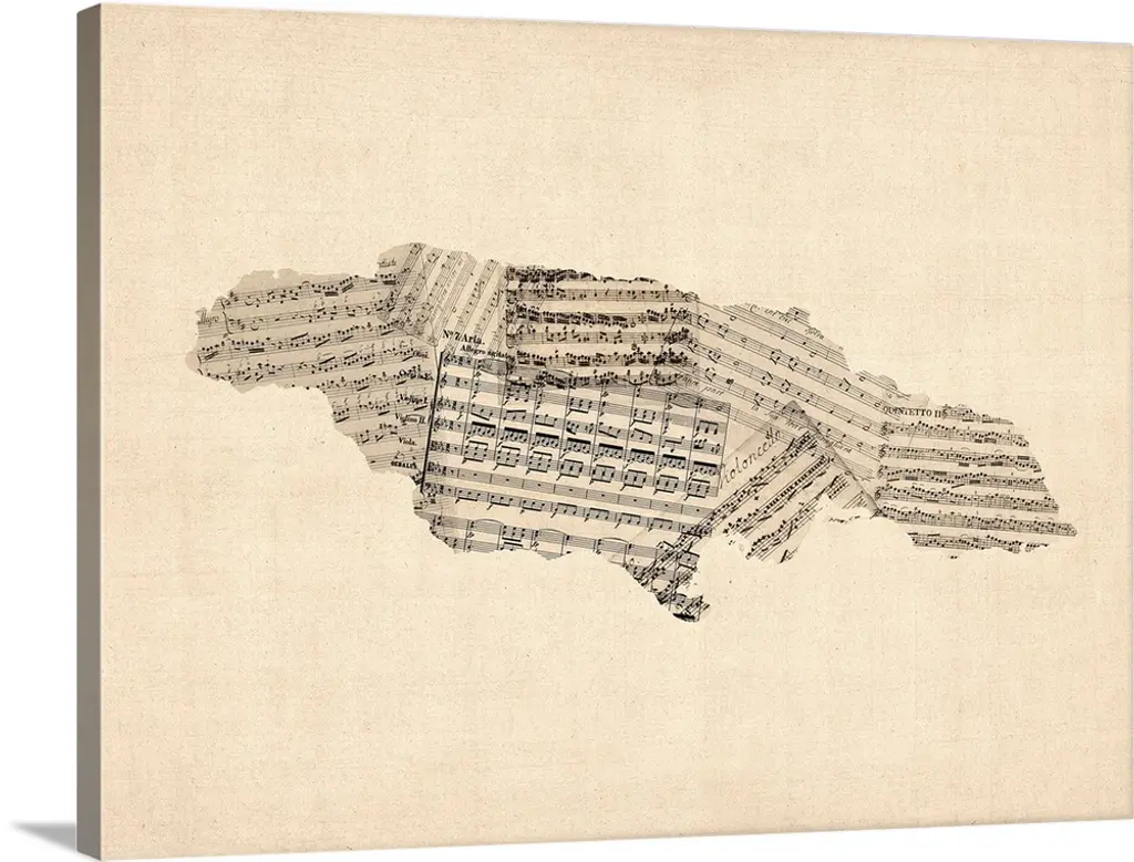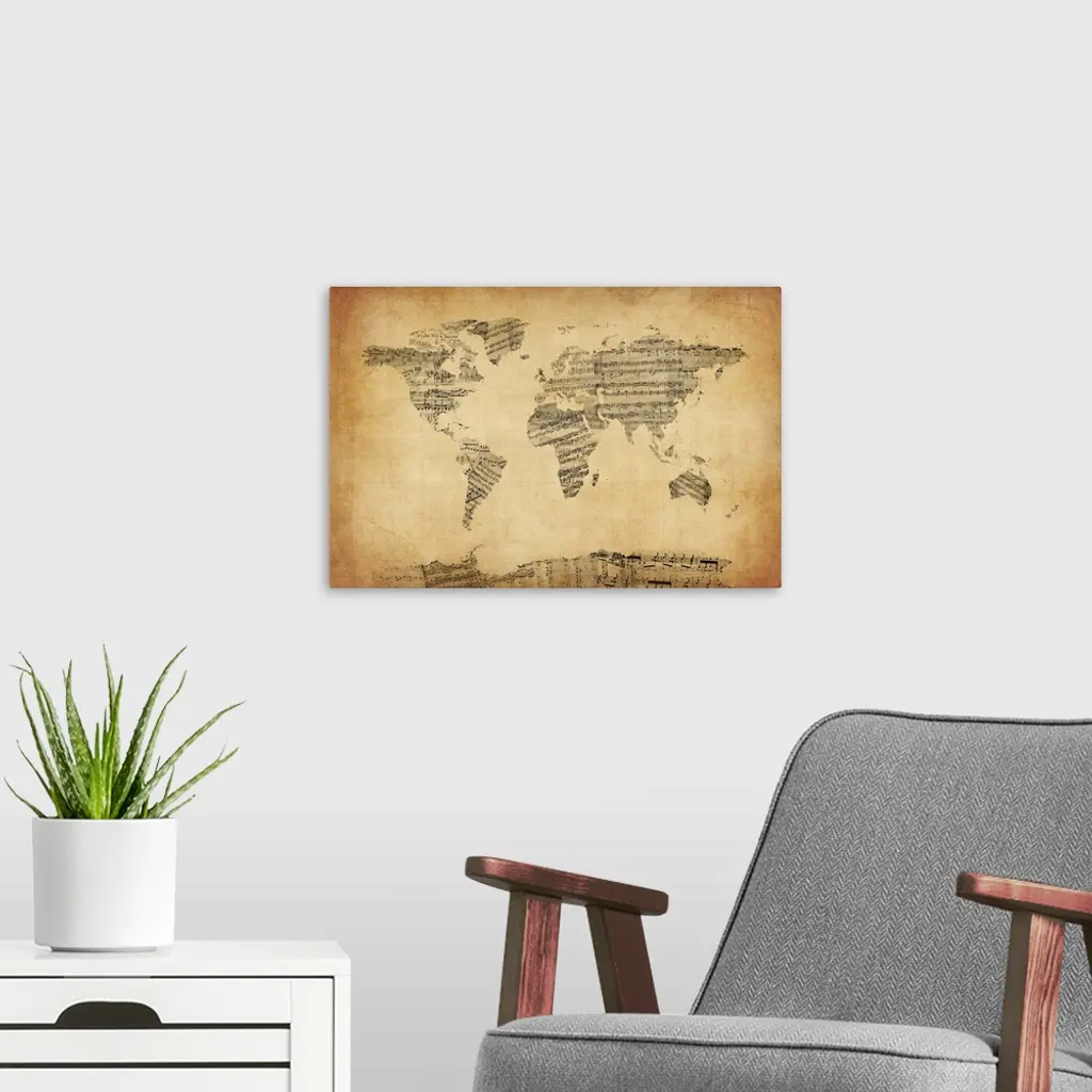 Contemporary artwork of a world map made from musical notation against a distressed background.