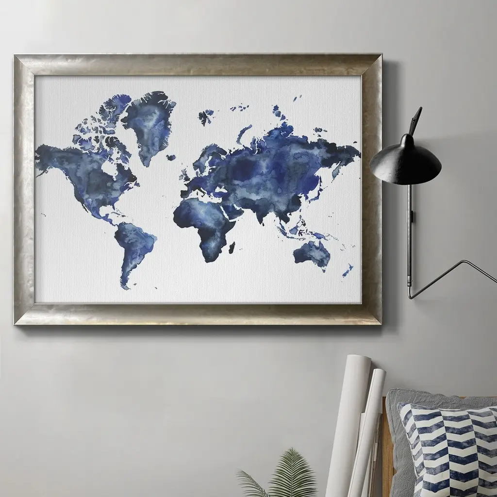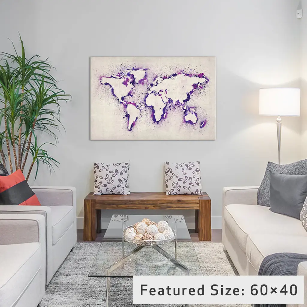 "Map Of The World, Purple Paint Splashes" Wrapped Canvas Print, 26x18x1.5