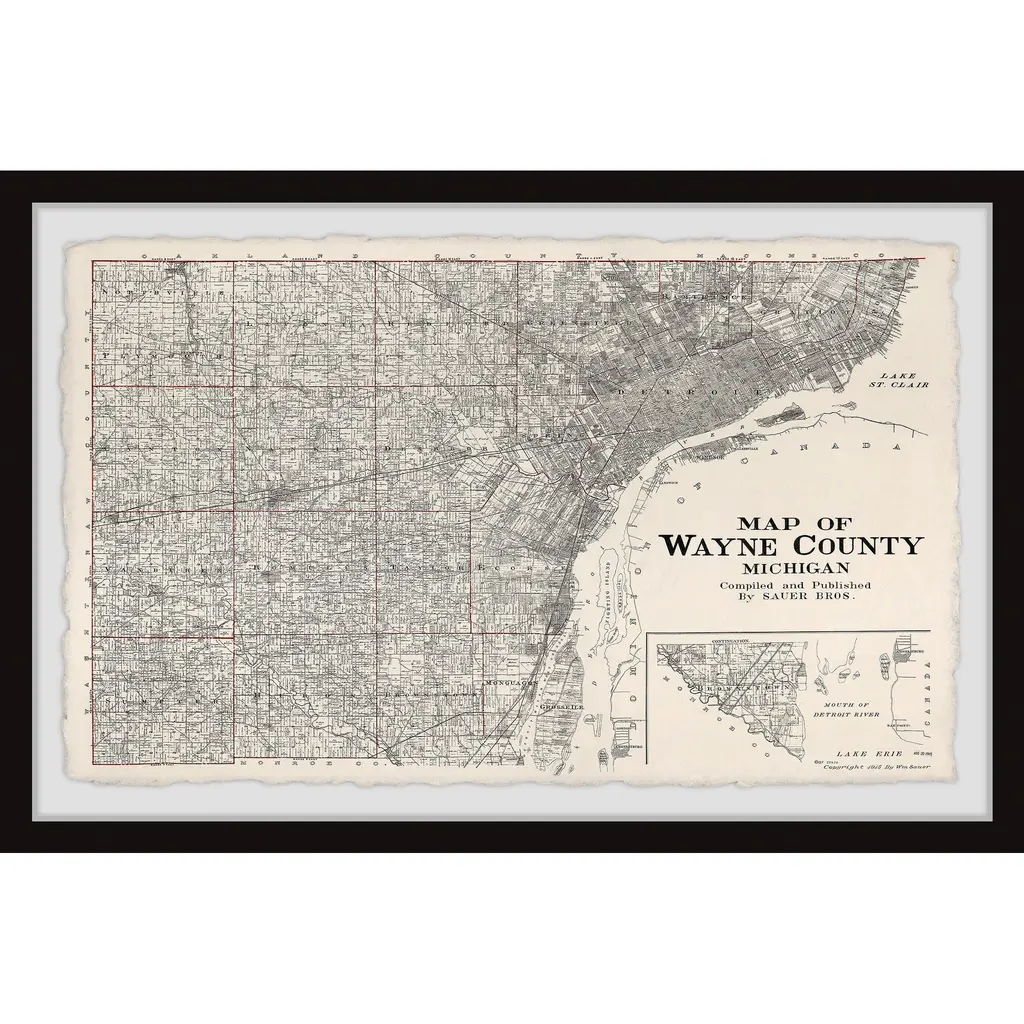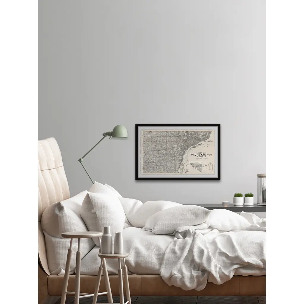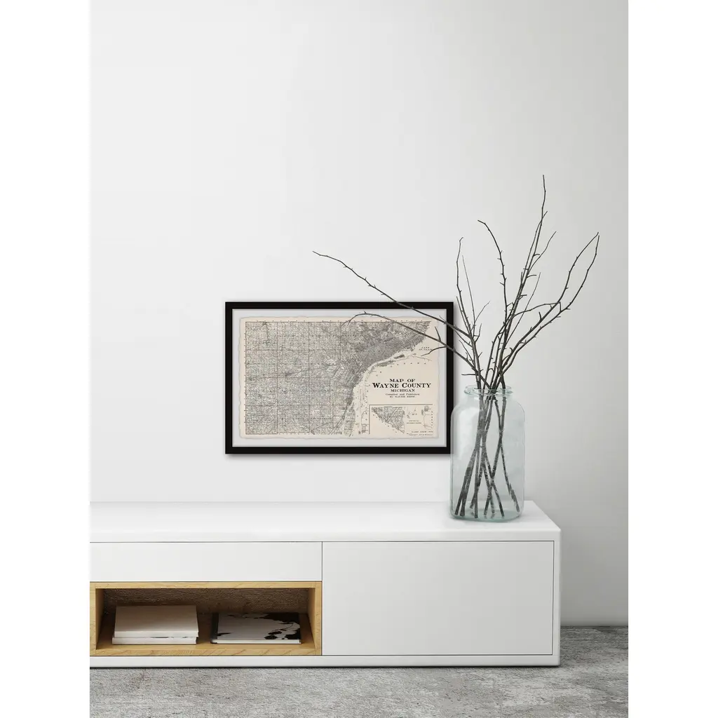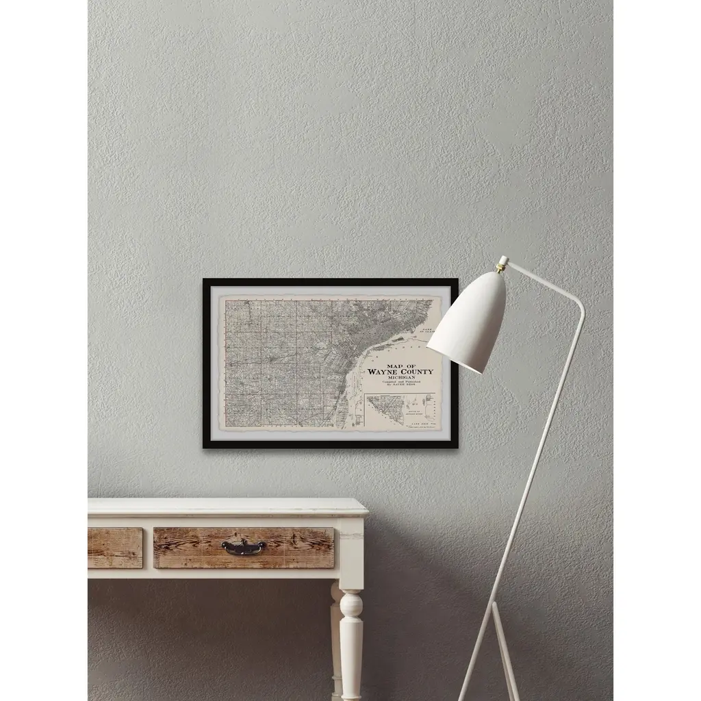 This print features a black and white map of Wayne County in Michigan state. Proudly printed in the USA, this piece is printed on high quality archive paper and professionally hand-framed. With wall-mounting hooks included, this artful accent is ready to hang up as soon as it reaches your front door. • Top quality Giclee print on high resolution Archive Paper • Hand cut deckled edges • High quality durable non-warping frame • Finished under shatter resistant plexiglass • Arrives ready to hang • Includes a certificate of authenticity • Printed in the USA