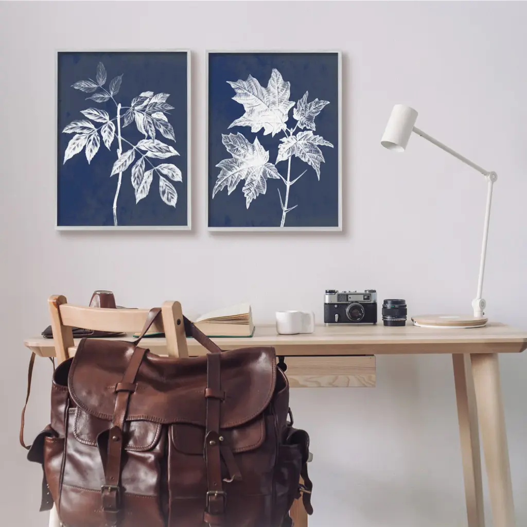 Maple Leaf Elm Stem Vintage Blue White Illustration,2pc, Each 16 X 20