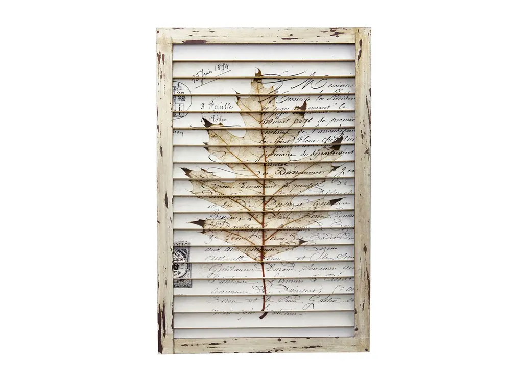 Vintage calligraphy and old world stamps overlay this textured Maple Leaf Window Shutter Wall Décor. Soft, neutral colors and weathered wood combine to give this piece a rustic, romantic feel. Hang the print in a collage of family photographs, or place atop the fireplace mantel for a year-round display for added height and dimension. Print includes frame.