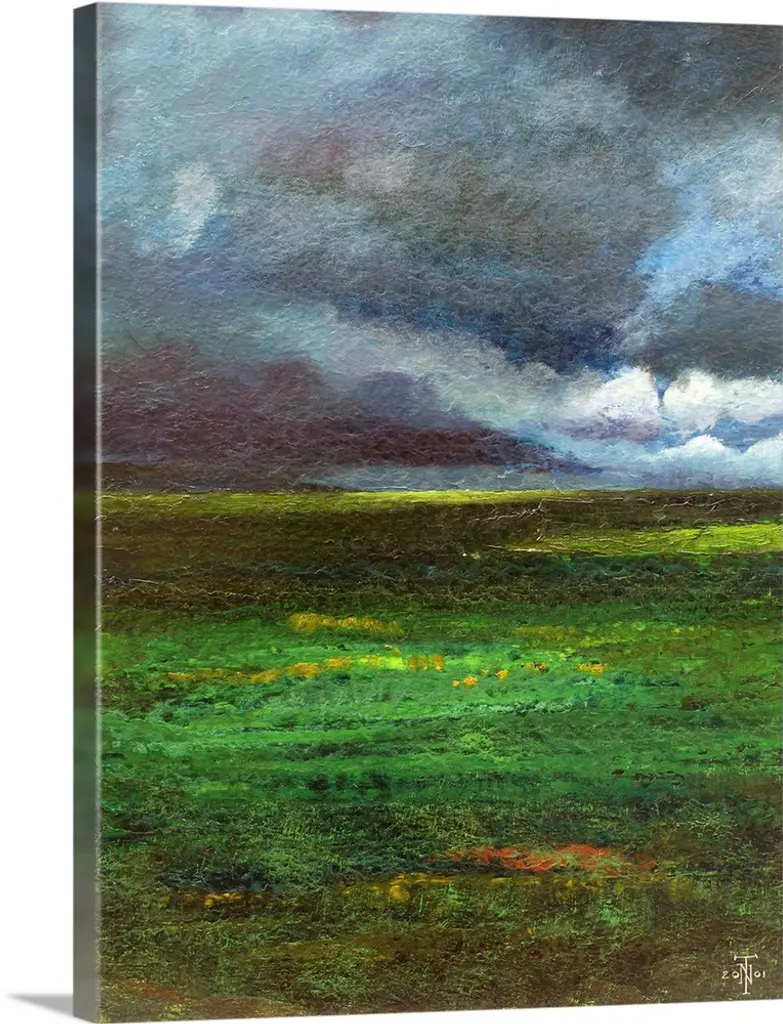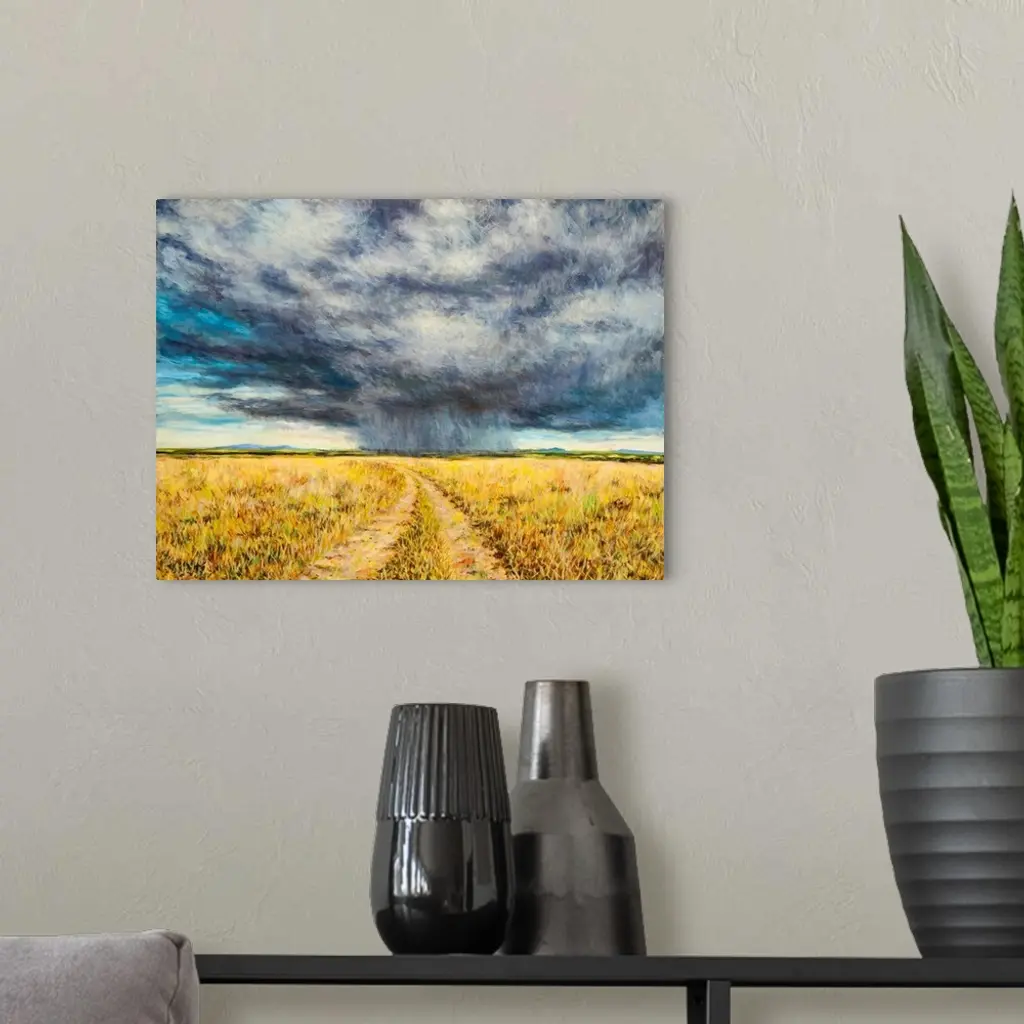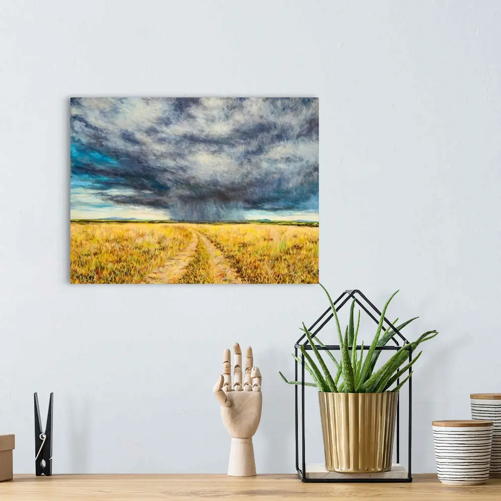 Contemporary painting of a storm advancing over the Kenyan plains.