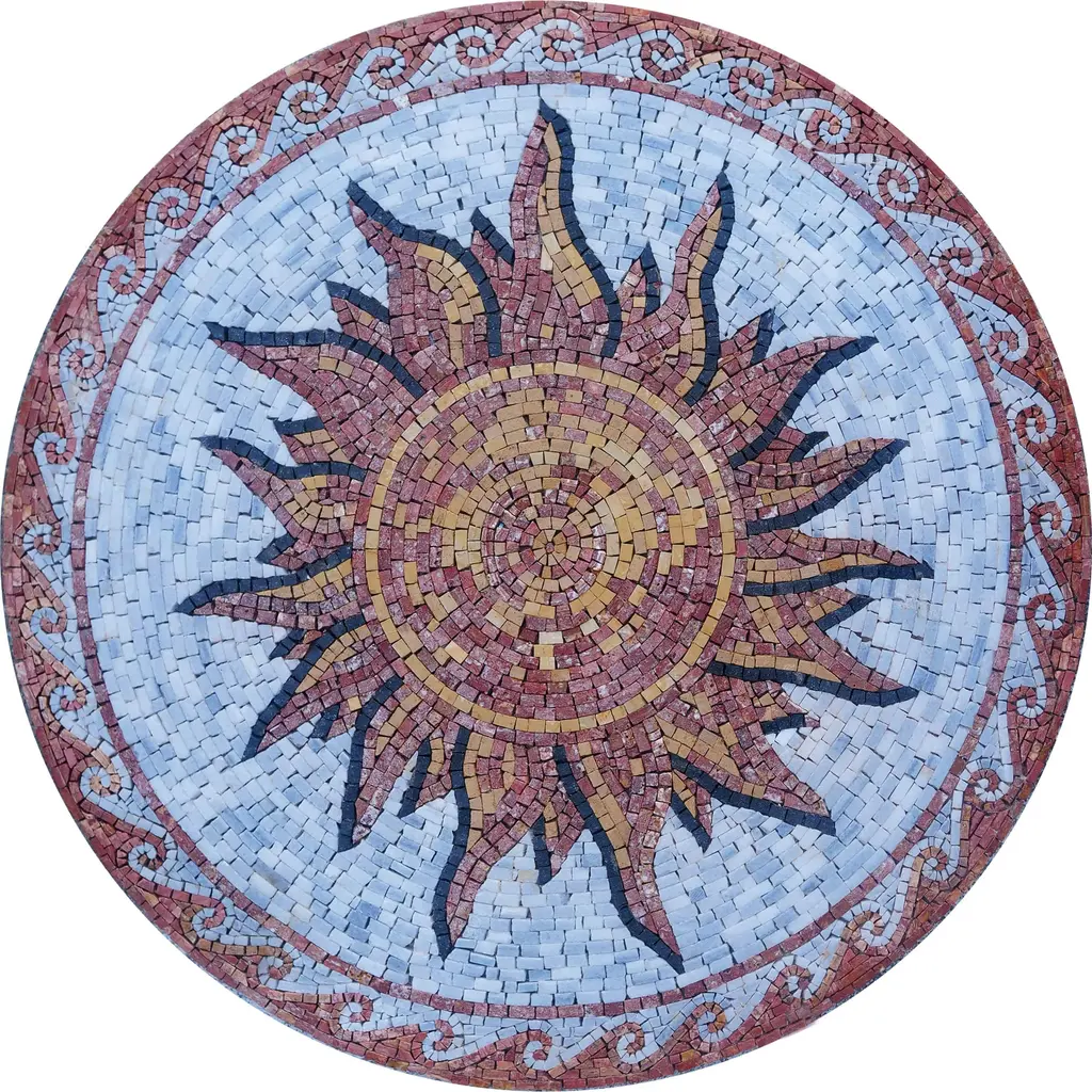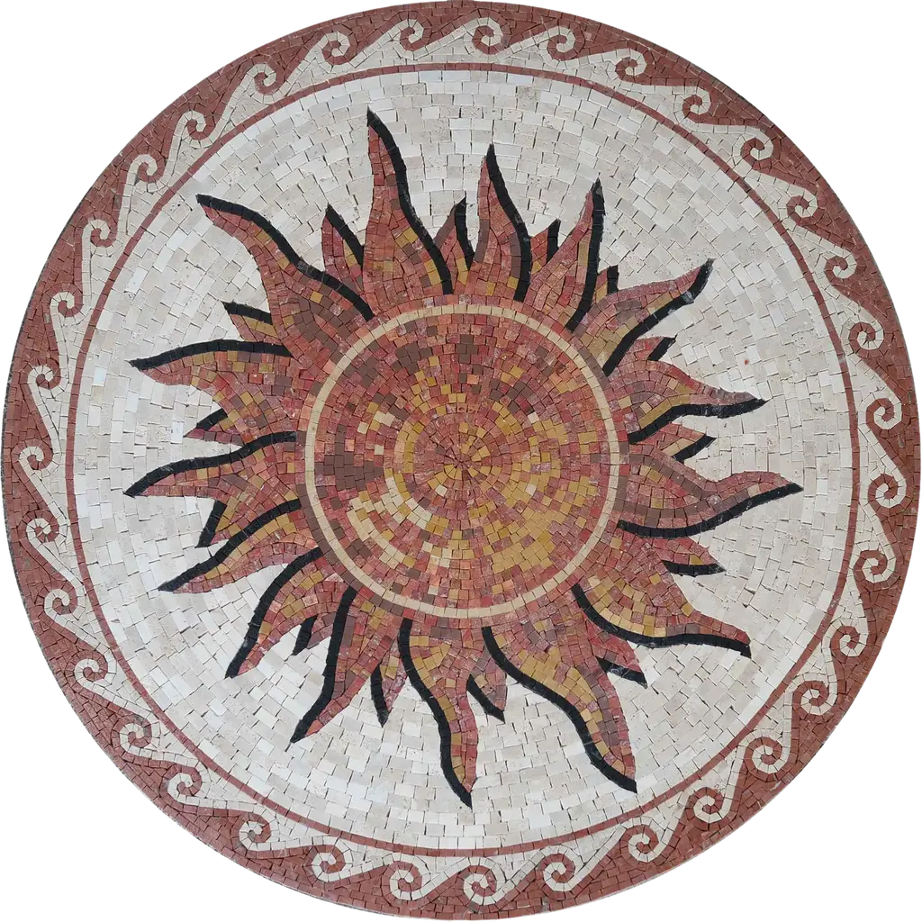 Introducing the Marble Mosaic Design - Reddish Sun, a stunning centerpiece that brings warmth and vibrancy to any space. This exquisite mosaic medallion features a captivating design of a fiery sun, radiating with energy and passion. The intricate details are highlighted by beautiful red waves that elegantly encircle the sun, creating a harmonious blend of color and craftsmanship that is both dynamic and inviting.Crafted with the finest quality marble, this artwork is not just a decorative piece; it is a statement that elevates its surroundings. The warm tones of red and orange capture the essence of a sunset, bringing a sense of comfort and warmth to your home. Whether you choose to showcase this mosaic as a stunning tabletop centerpiece or install it as a unique focal point on your wall or floor, it promises to add a touch of elegance and charm to any interior.Imagine this enchanting piece in your living room, dining area, or hallway, where it can draw admiration and spark conversations among your guests. It’s perfect for those who love to add a touch of artistry to their home decor, and its versatile design allows it to complement a variety of styles, from traditional to contemporary.Installation is a breeze, whether you decide to use it as flooring, a wall accent, or a decorative tabletop. Its durable marble construction not only ensures longevity but also makes it easy to maintain, allowing you to enjoy its beauty for years to come.Transform your living space with the Marble Mosaic Design - Reddish Sun, a piece that embodies warmth, artistic flair, and timeless beauty. Elevate your decor with this unique artwork and bask in the radiant glow of the fiery sun every day.