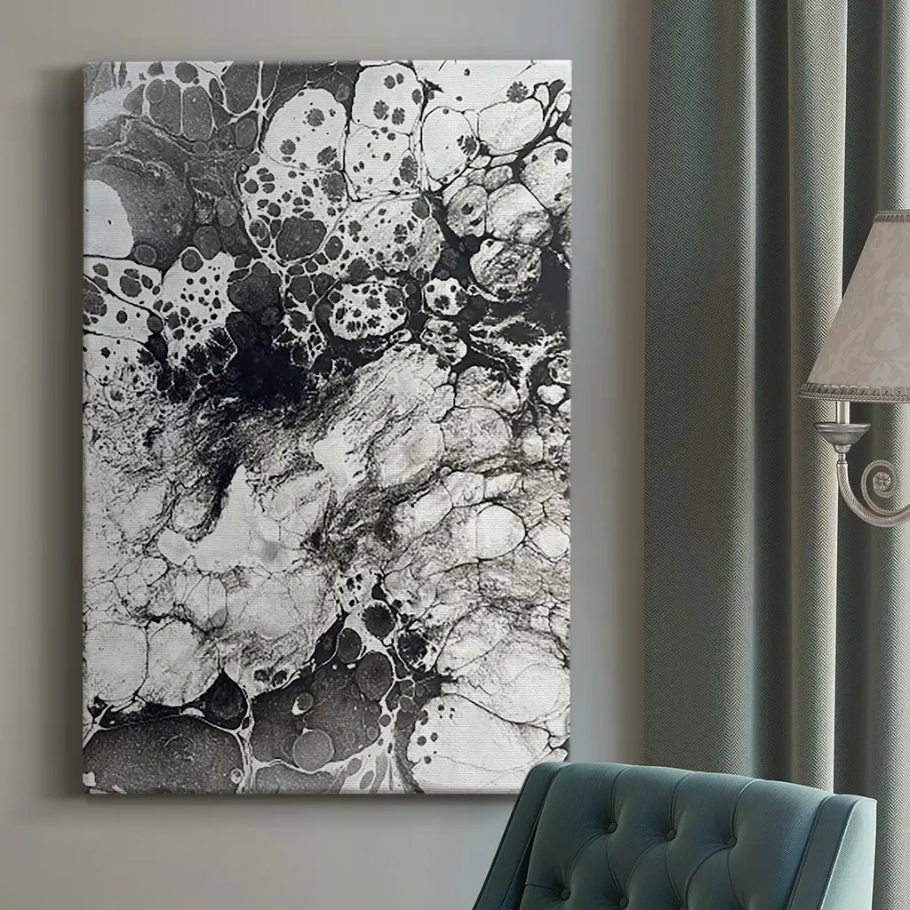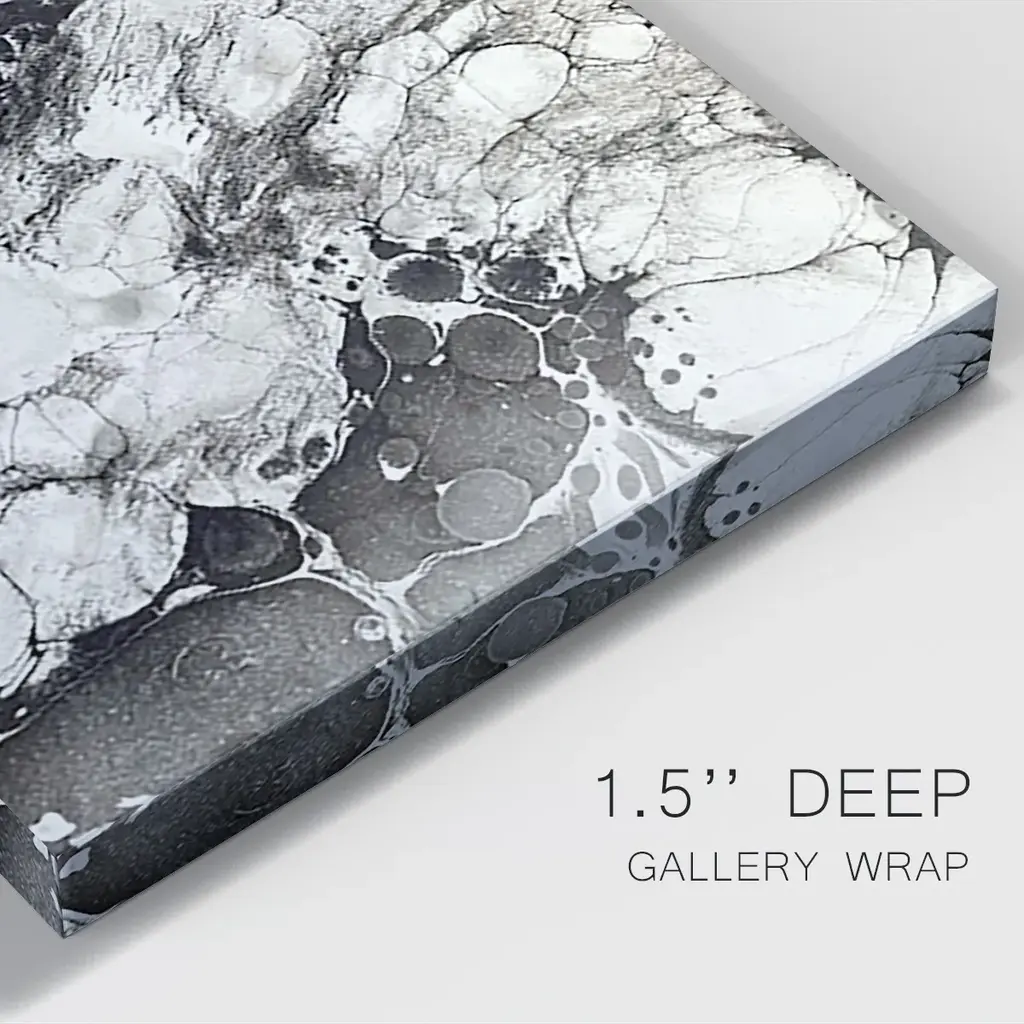 Marbling IX Premium Gallery Wrapped Canvas - Ready to Hang A premium hand stretched gallery wrapped canvas print created to last. Featuring a beveled a solid wood stretcher bar, each piece comes ready to hand 6 SIZES AVAILABLE 8''X12'' - Overall Size 12''X18'' - Overall Size 18''X27'' - Overall Size 24''x36'' - Overall Size 32''x48'' - Overall Size 40''x60'' - Overall Size Each piece is made to order. Built to Last Each piece comes ready to hang Solid wood stretcher Fade and Water resistant Made domestically