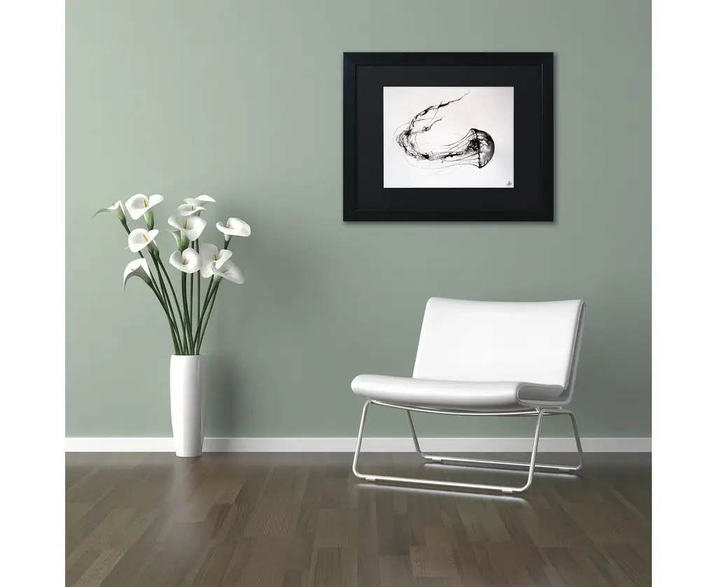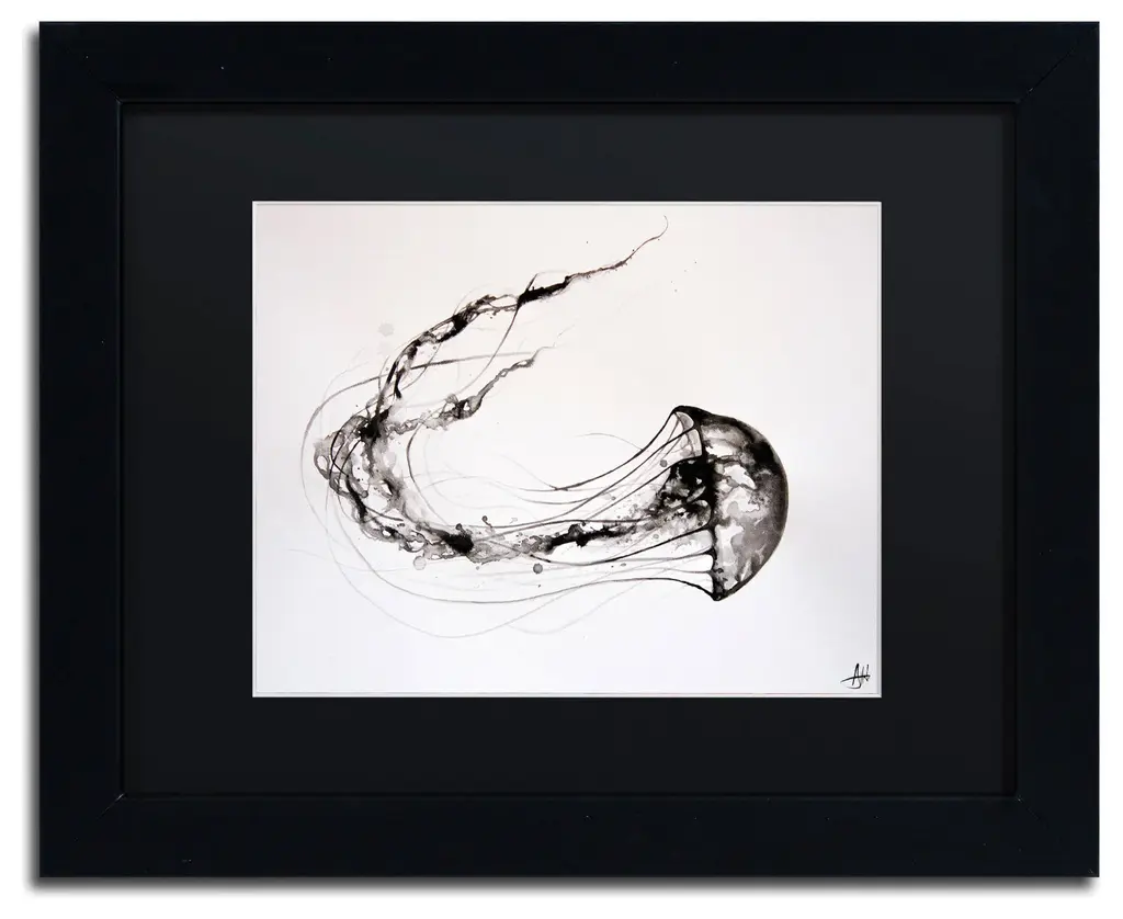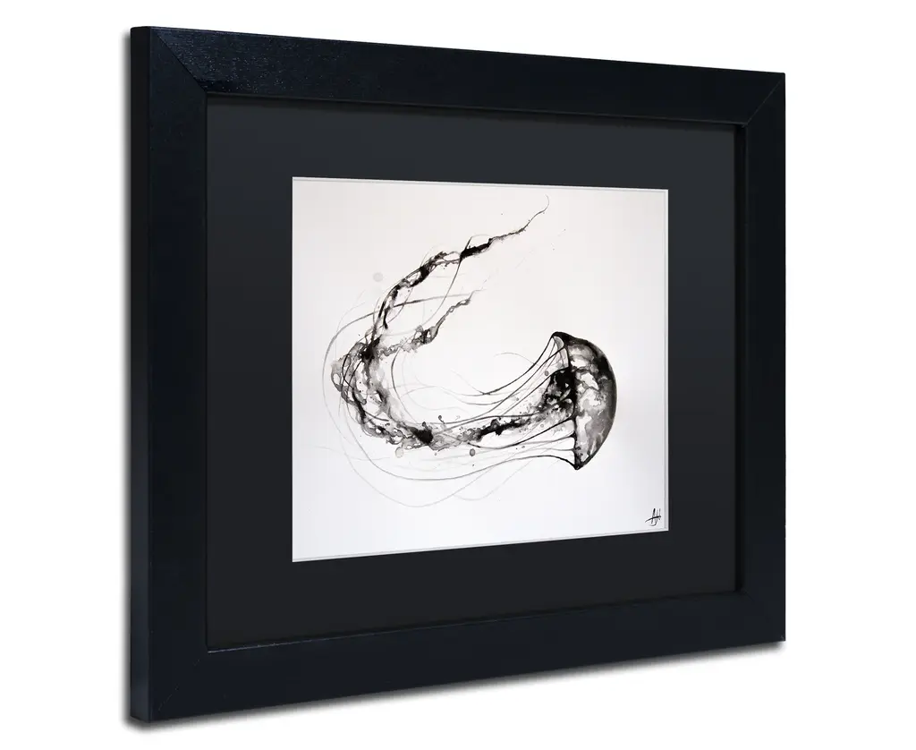 Artist: Marc AllanteSubject: AnimalsStyle: ContemporaryProduct Type: Black Frame, Black Mat, AcrylicMade in USAThis ready to hang, matted framed art piece features a black and white ink drawing of a jellyfish.Hong Kong born artist Marc Allante exhibited a passion for the visual arts from an early age. Having lived in Hong Kong, Sydney and London, his work is inspired in both form and style by these western and eastern influences. Merging traditional Chinese inks with European watercolour and pen techniques in a contemporary style reflects the fusion of his Chinese-French ancestry and brings it into a modern context. Represented by the Avenue Des Arts gallery in Hong Kong, this entirely self taught artist utilizes a variety of techniques, subject matter and themes to expand the repertoire of his ink and art collection.An 8x10 giclee print under acrylic in an 11x14 black frame. Giclee (jee-clay) is an advanced printmaking process for creating museum quality fine art reproductions. This high quality print is matted using black matting and comes in a black frame. A clear acrylic facing is added to protect the print. The piece is fully assembled by professional framers and comes ready to hang. The black mat allows the image to really stand out, making it a great addition to any space.
