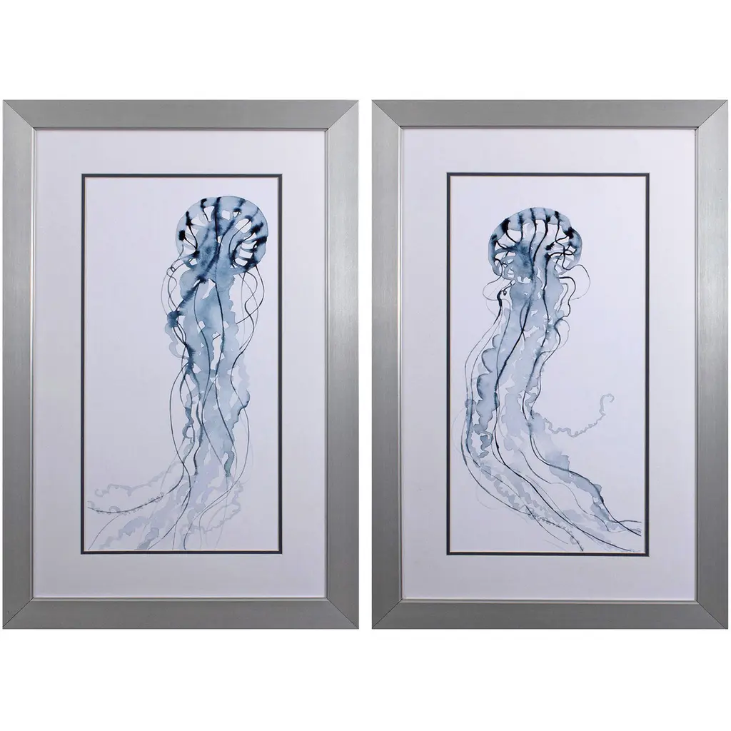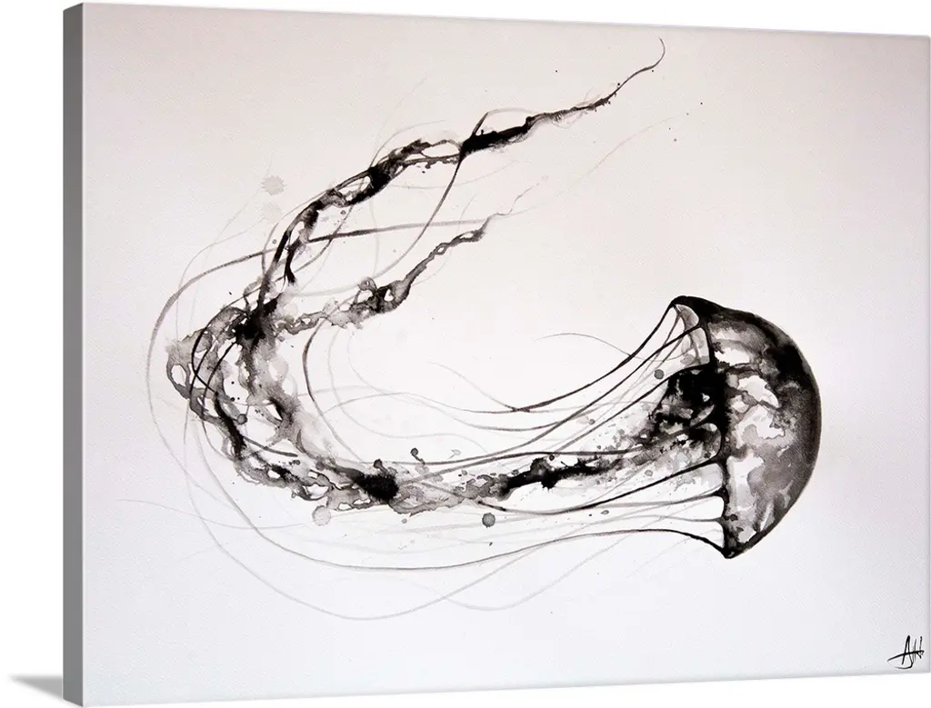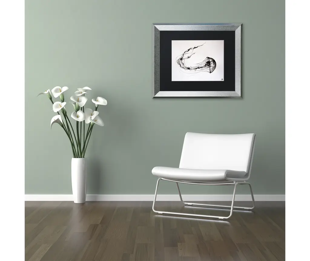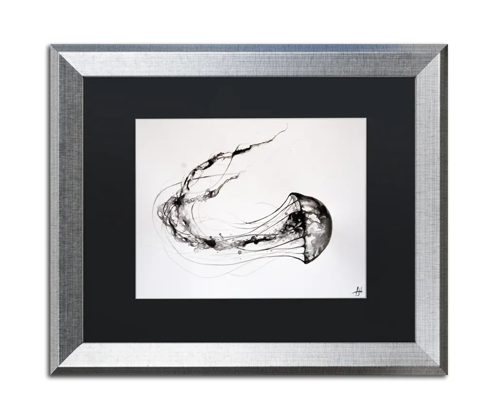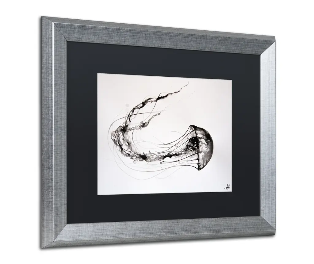 Artist: Marc AllanteSubject: AnimalsStyle: ContemporaryProduct Type: Silver Frame, Black Mat, AcrylicMade in USAThis ready to hang, matted framed art piece features a black and white ink drawing of a jellyfish.Hong Kong born artist Marc Allante exhibited a passion for the visual arts from an early age. Having lived in Hong Kong, Sydney and London, his work is inspired in both form and style by these western and eastern influences. Merging traditional Chinese inks with European watercolour and pen techniques in a contemporary style reflects the fusion of his Chinese-French ancestry and brings it into a modern context. Represented by the Avenue Des Arts gallery in Hong Kong, this entirely self taught artist utilizes a variety of techniques, subject matter and themes to expand the repertoire of his ink and art collection.An 11x14 giclee print under acrylic in a 16x20 silver frame. Giclee (jee-clay) is an advanced printmaking process for creating museum quality fine art reproductions. This high quality print is matted using black matting and comes in a silver frame. A clear acrylic facing is added to protect the print. The piece is fully assembled by professional framers and comes ready to hang. The black mat allows the image to really stand out, making it a great addition to any space.