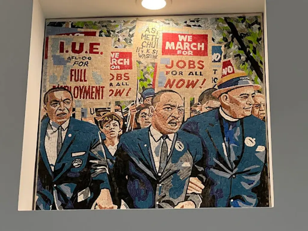 This powerful mosaic artwork commemorates a pivotal moment in the fight for civil rights. The scene pulsates with energy as figures march forward, their determined faces and raised signs a testament to their unwavering pursuit of justice. Martin Luther King Jr. takes center stage, his iconic presence a symbol of hope and resilience. The artist's skillful use of tesserae captures the intensity of the moment, the vibrant colors and dynamic composition conveying the urgency of their cause. This mosaic serves as a poignant reminder of the struggles and triumphs of the civil rights movement, inspiring viewers to continue the fight for equality. More than just a depiction of a historical event, it's a call to action, a reminder that the journey towards justice is ongoing.