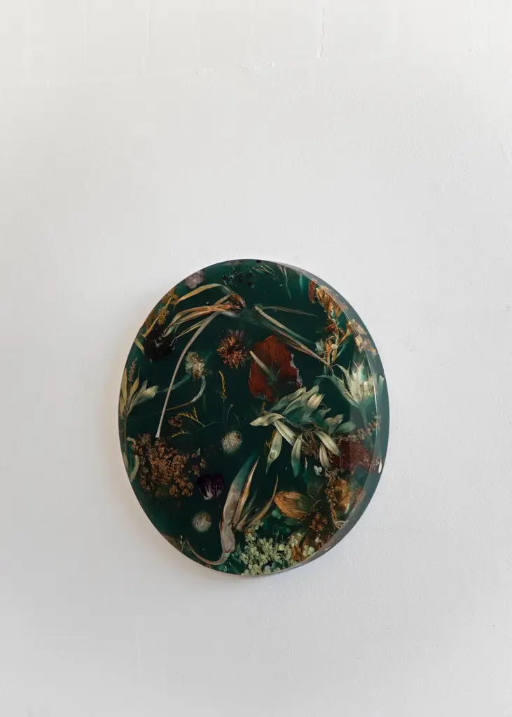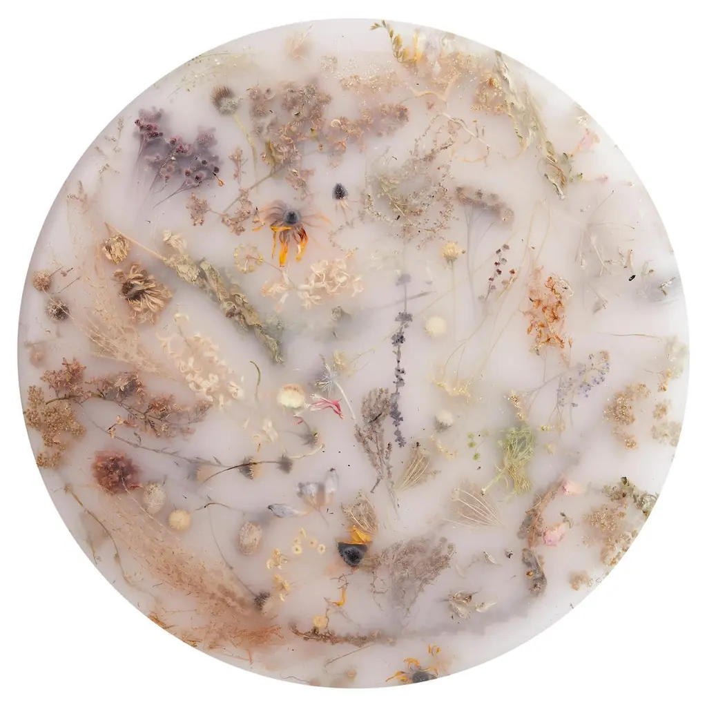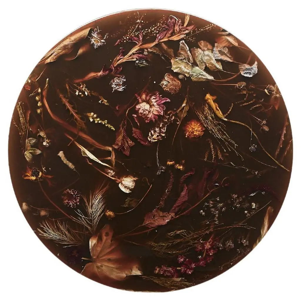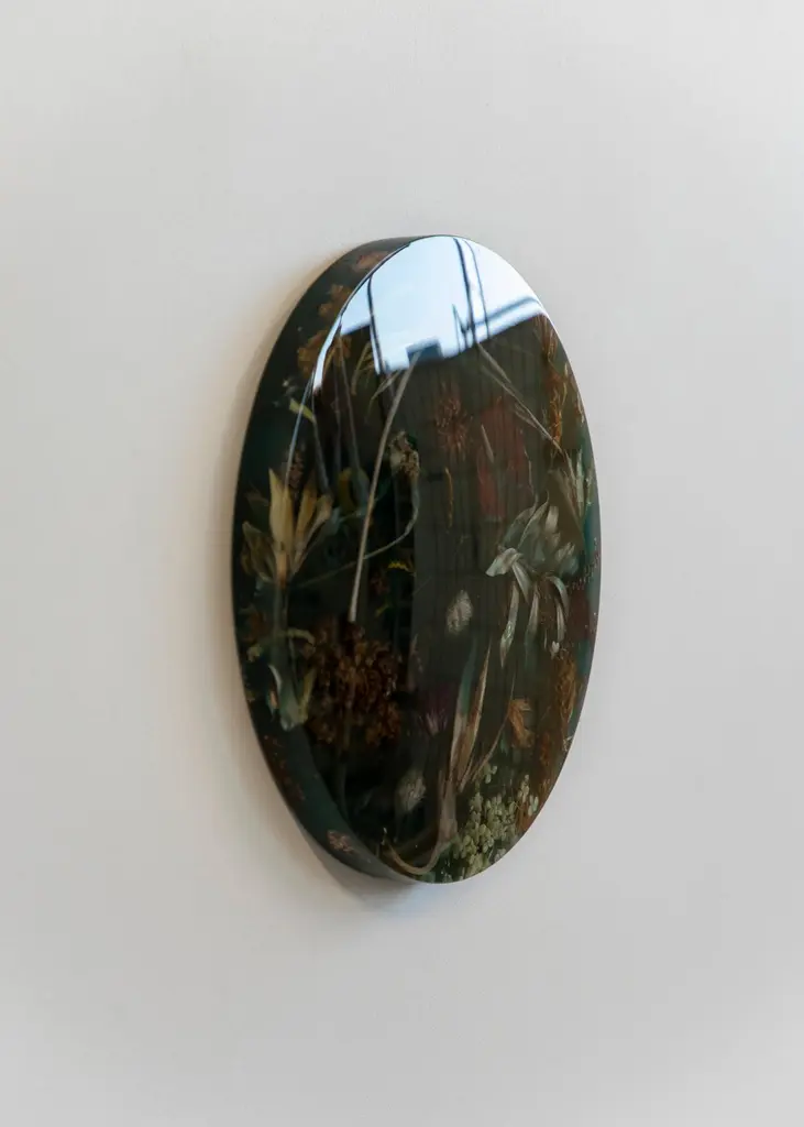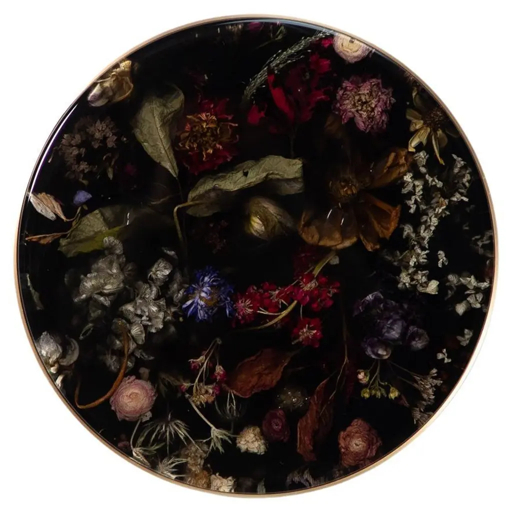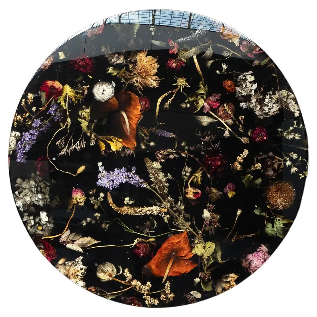 Part of Marcin Rusak’s signature Flora collection, the wall-hanging Flora Lens 40 constitutes a unique decorative piece that works well in a variety of settings. Based on discarded flowers carefully submerged in resin, this convex piece is entirely handmade in a labour-intensive process, in which everything, from collecting and processing the flowers to encapsulating them in cast resin, and to setting the material on an aluminium wall hanging system, is done by hand. The piece is thus entirely unique and customisable in a variety of sizes, colours and finishes, from matte (satin) to polished (glossy), and from black to milky white, to various shades of honey, amber, rust and green, as well as fully transparent. Each piece is composed almost like a painting, with the artist selecting the botanical matter based on its sculptural qualities and unique colours. The convex relief form of Flora Lens 40 acquires a particular depth, with flowers floating just underneath the shiny surface creating a more spatial, three-dimensional and complex composition. A resemblance to traditional Flemish still lifes is intentional and almost unavoidable. The artist makes several compositions, and only when the effect is satisfactory does he translate it into the material. The price includes packing and crating in airfreight wooden fumigated crate.The price excludes shipping costs, import duties and taxes, if applicable.