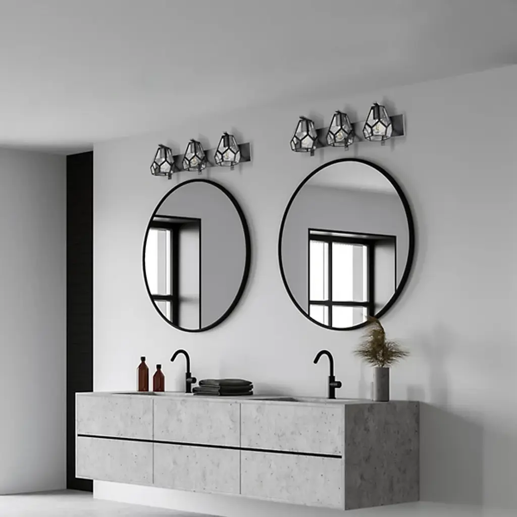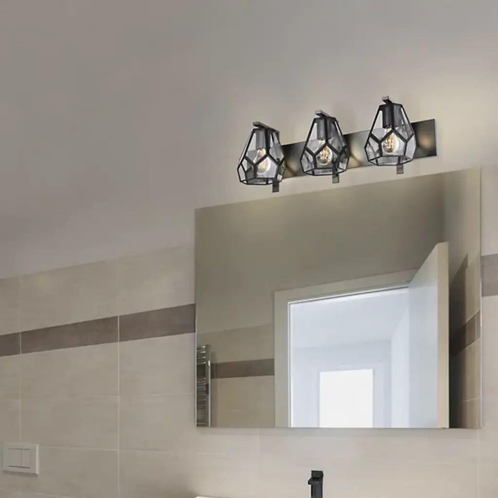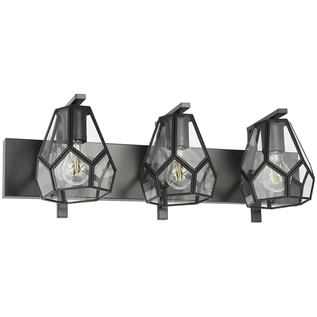 A multifaceted look for a contemporary bathroom. The Mardyke Vanity Light by Eglo features geometric glass shades arranged along a sleek steel wall plate. All the facets of the diamond-shaped shades are also outlined in matching steel, further emphasizing their distinctive angles. In place over a mirror in an industrial modern bathroom or minimalist powder room, this vanity light adds a welcome touch of glamour as well as bright light for vanity area tasks.