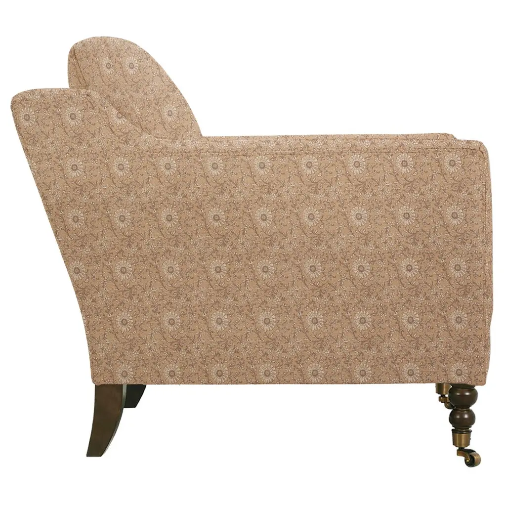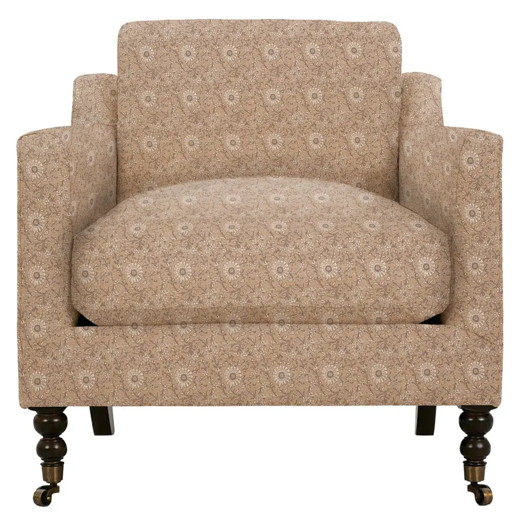 Exclusive to One Kings Lane: Showcasing a charming daisy block print upholstery, and gracefully turned front legs, the Margot Chair, Daisy Block Print combines classic elegance with a playful floral design. With generous feather-and-down cushioning, this armchair offers both supreme comfort and timeless style. Also of note:• Brass casters on the front legs allow for easy movement without scratching your floors.• Frame: crafted from solid kiln-dried hardwood for long-lasting durability.• Cushion Fill: cloud cushion featuring a high-resiliency foam core, wrapped in a super soft foam layer, encased in a channel-quilted cover filled with a blend of 50% fiber, 5% down, and 45% feather.• Seat Construction: sinuous-springs system with heavy-gauge steel springs for uniform comfort, doubled at each end to withstand everyday use.• Seat Comfort: plush yet supportive, requiring regular fluffing and rotation to maintain shape.