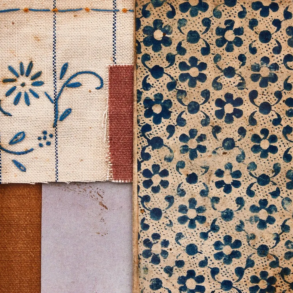 A scanned collage of French paper from the 1700s by artist Shaina Page, bringing color and visual interest. Handmade in Austin, TX.