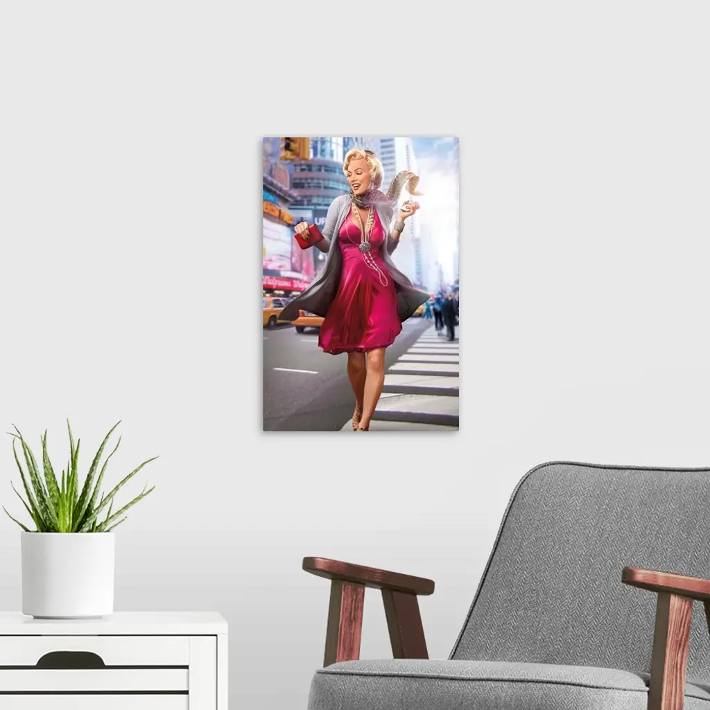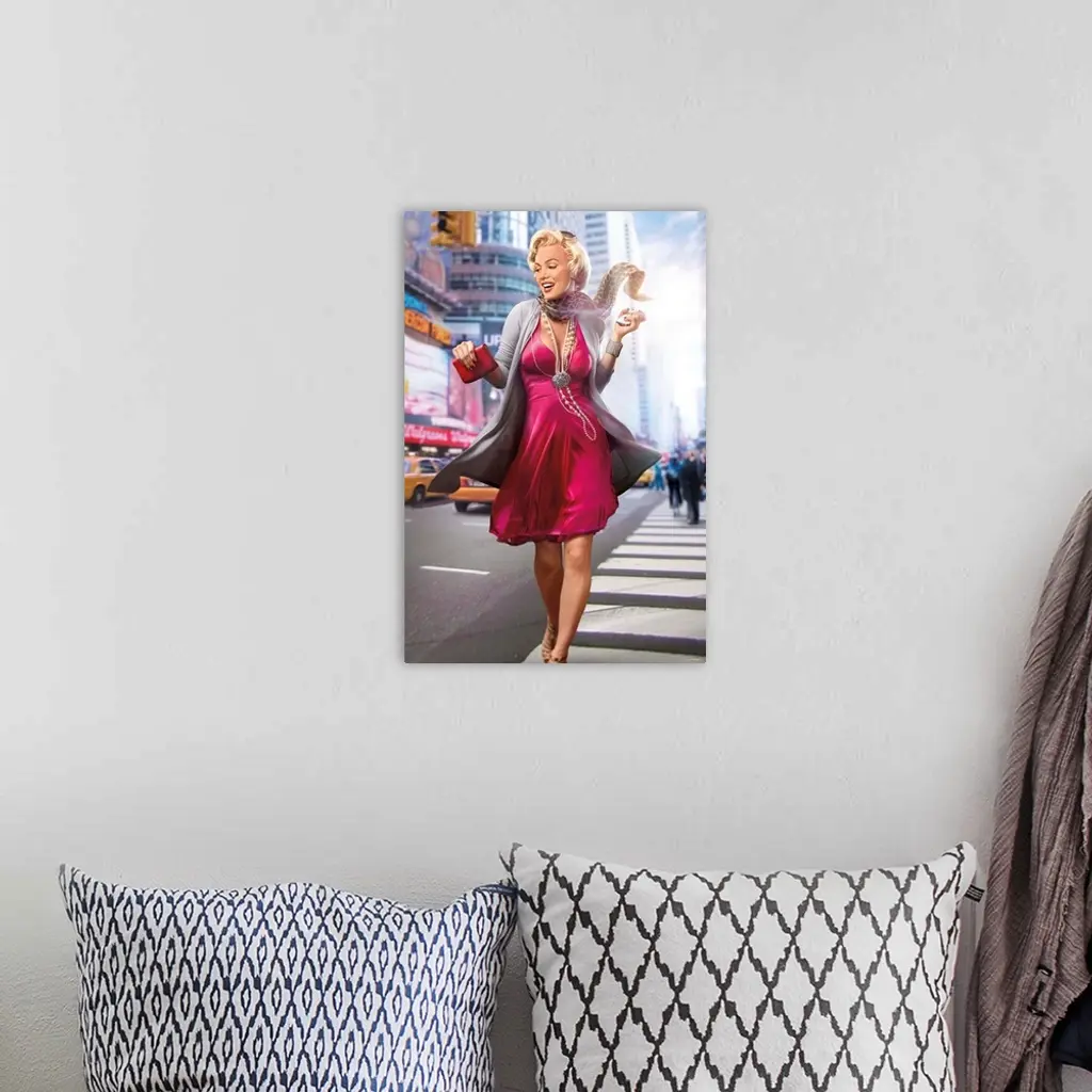 Digital art painting of Marilyn Monroe, in full color, strolling down the avenue in New York City by JJ Brando.