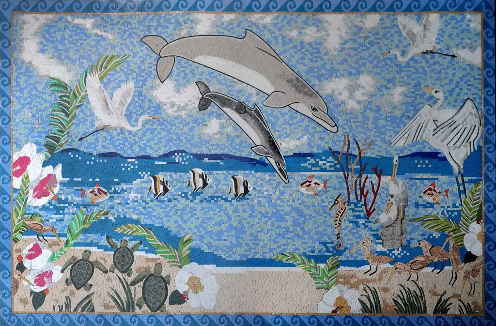Dive into a vibrant world where the beauty of marine life meets the charm of land creatures with our exquisite "Marine Life Meets Land Life - Handcut Mosaic." This stunning mosaic artwork brings together an array of colorful sea creatures and terrestrial animals, beautifully illustrating the harmonious coexistence of both realms. Each piece is meticulously hand-cut and assembled, showcasing the intricate details and vibrant colors that reflect the wonder of nature.Imagine a scene where playful dolphins dance alongside curious deer, while lively fish swim amidst lush trees, all captured in this magnificent artwork. It’s not just a decoration; it's a conversation starter, an invitation to explore the artistry of nature, and a testament to the beauty that surrounds us.Perfect for both indoor and outdoor settings, this mosaic piece can brighten up any space, whether hung in your living room, garden, or patio. Its weather-resistant design makes it suitable for outdoor display, ensuring that the colors remain vivid and captivating in any environment.Whether you're an ocean lover, a wildlife enthusiast, or simply someone who appreciates fine art, this handcut mosaic will add a splash of color and life to your surroundings. Bring home this unique artistic expression and let it inspire feelings of tranquility and connection to the natural world. Transform your space with this breathtaking piece that celebrates the wonders of marine and land life in a spectacular way.