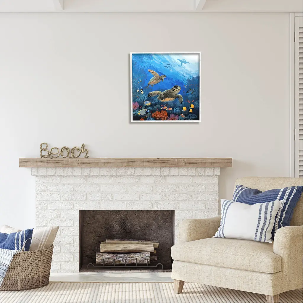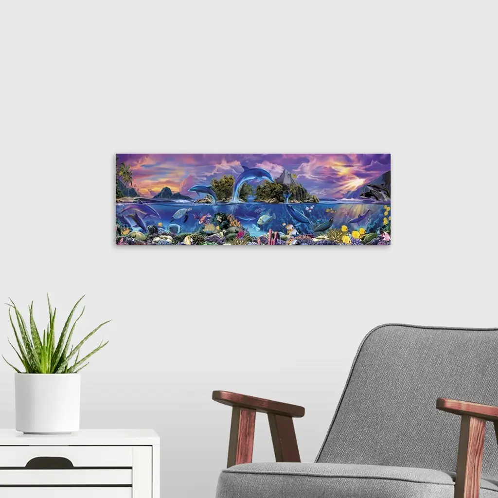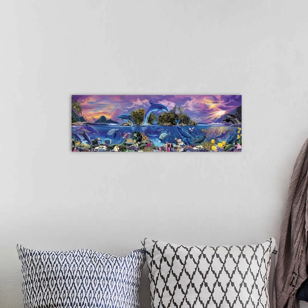 A painting of marine life, such as dolphins, sea turtles, and tropical fish, collaged together using vivid and pastel colors in panoramic shaped art work that is perfect for a young girlos bed room.