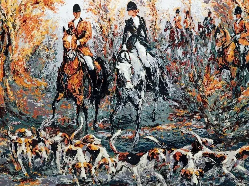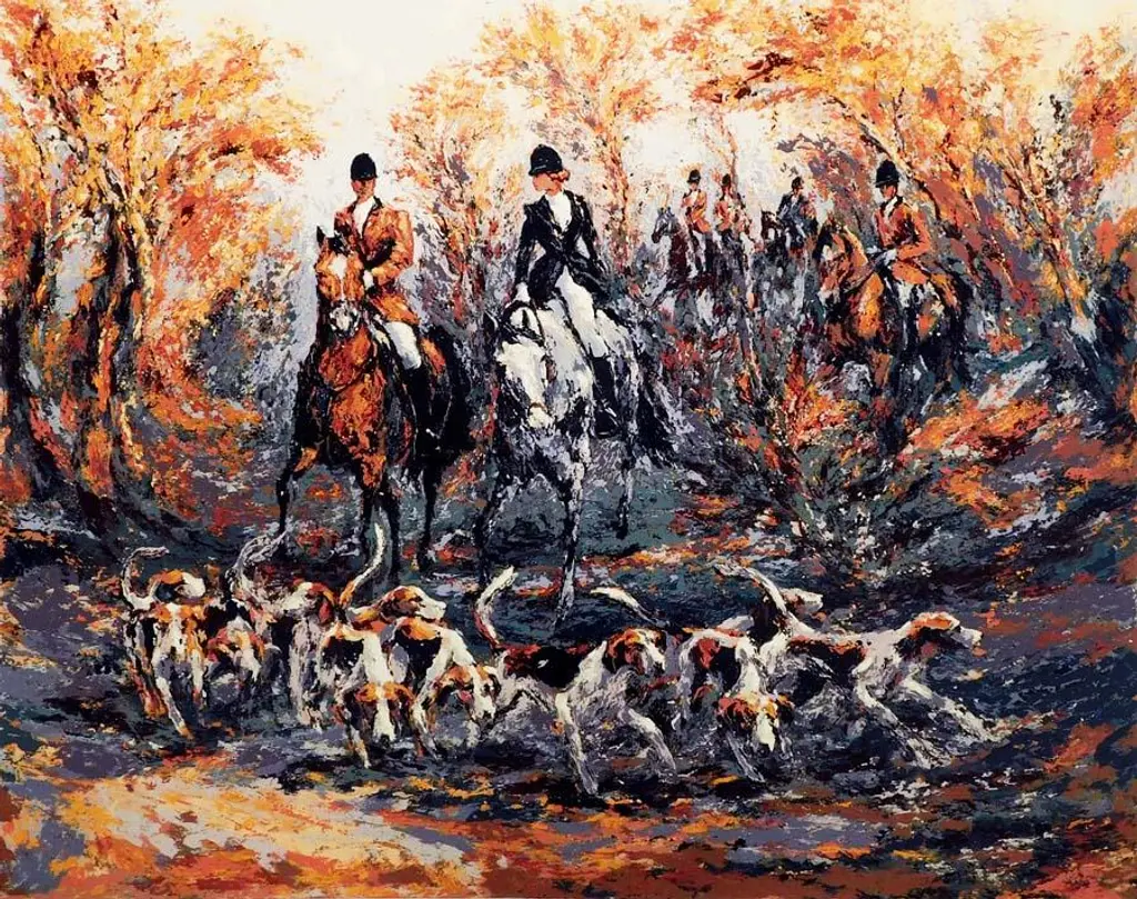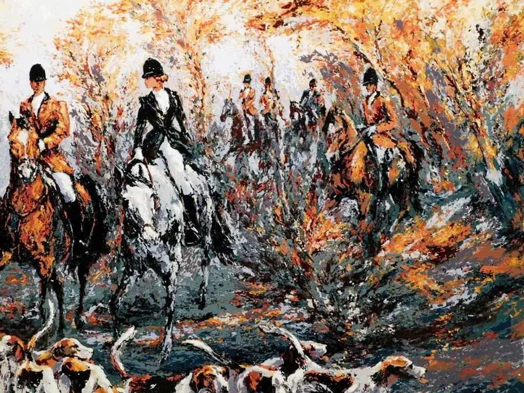 "Autumn Hunt" by Mark King Original Limited Edition Serigraph on Paper Hand signed by the artist Image Size: 30" x 37.5" Paper Size: 36" x 43" Edition Size: 255 (contact seller for detail) 100 percent guarantee of authenticity Condition: Mint Certificate of Authenticity and appraisal is included. Mark King Born in Bombay in 1931 of British parents. Mark King is the product of an exotic and privileged upbringing in India, where he lived until the age of sixteen. In 1948, following graduation from La Martiniere College in Calcutta, where his focus had been botany as well as art, King sailed to England to attend Bournemouth College of Art, having determined to pursue painting, sculpture, architecture and theatre design. He subsequently spent seven years as Resident scenic designer at the Oxford Playhouse Theatre, but in 1961 decided to concentrate on painting and moved to Paris to study at the Ecole and the Louvre. Mark King uses his eyes as a passive organ, confronting the visual field.Objective and detached, he considers himself an "unobserved observer" .He explains that he makes no judgments about what he sees there s no right or wrong. it is there to be assimilated. Mark King believes that when there s no jamming of the cosmic forces influencing our receptivity, those energies and forces feed into us and it is those briefest fractions of a second when things flow.