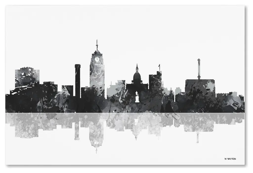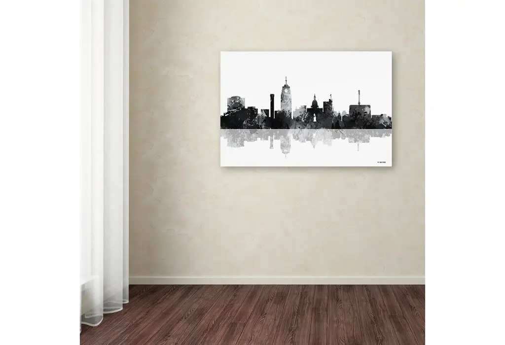 Artist: Marlene WatsonSubject: LandscapesStyle: ContemporaryProduct Type: Gallery-Wrapped Canvas ArtMade in USAThis ready to hang, gallery-wrapped art piece features a black and white painted skyline of Lansing, Michigan.Born in Scotland and now residing in Hong Kong, Marlene Watson has been painting her way through life. She paints things she notices in everyday life and brings out her positive energy through her work. Marlene has gallery showings and has also illustrated a children's book. She cares for 12 cats and works toward animal conservation and rescues with her art.Giclee (jee-clay) is an advanced printmaking process for creating high quality fine art reproductions. The attainable excellence that Giclee printmaking affords makes the reproduction virtually indistinguishable from the original piece. The result is wide acceptance of Giclee by galleries, museums, and private collectors. Gallery wrap is a method of stretching an artist's canvas so that the canvas wraps around the sides and is secured a hidden, wooden frame. This method of stretching and preparing a canvas allows for a frameless presentation of the finished painting.