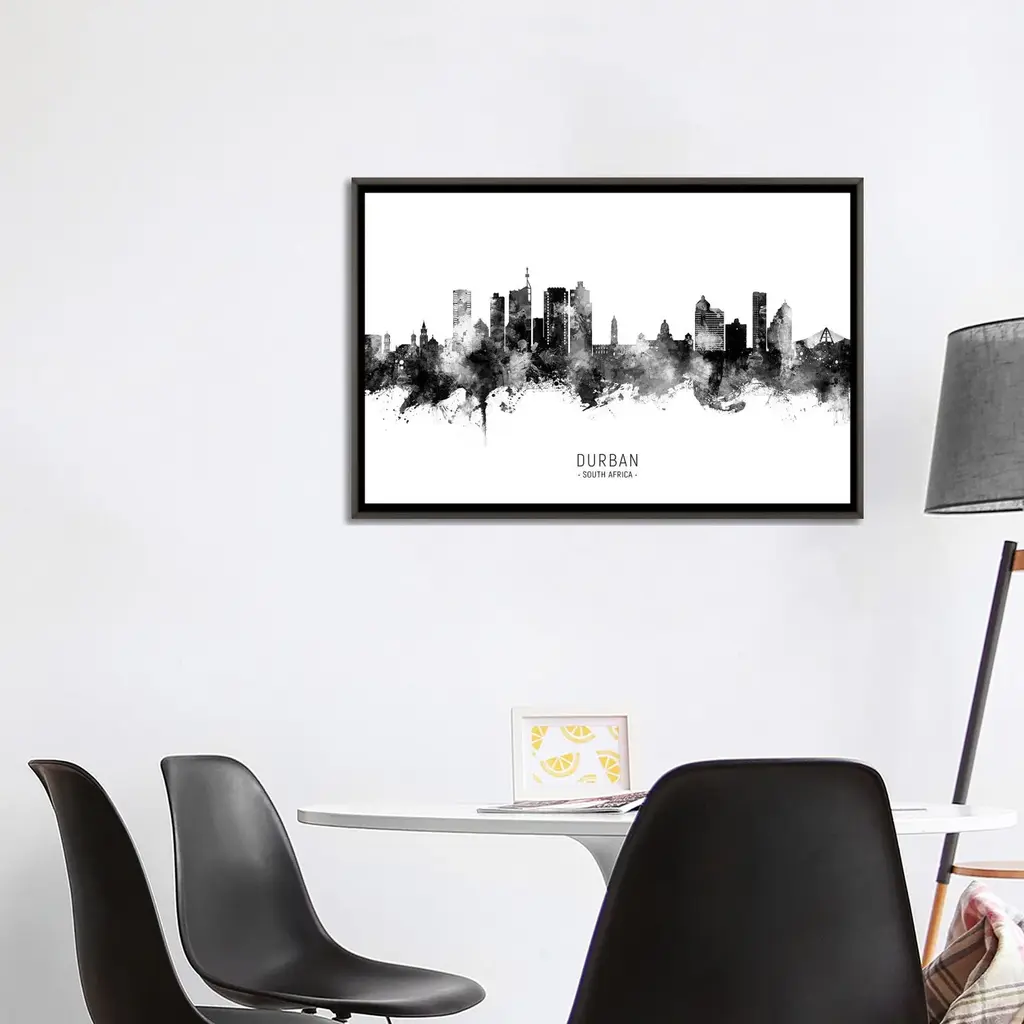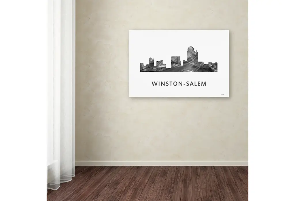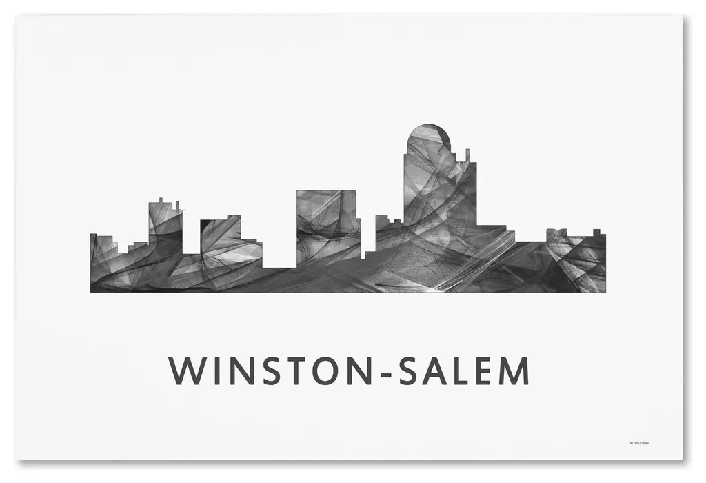 Artist: Marlene WatsonSubject: LandscapesStyle: ContemporaryProduct Type: Gallery-Wrapped Canvas ArtMade in USAThis ready to hang, gallery-wrapped art piece features a black and white designed silhouette of the Winston-Salem, North Carolina skyline.Born in Scotland and now residing in Hong Kong, Marlene Watson has been painting her way through life. She paints things she notices in everyday life and brings out her positive energy through her work. Marlene has gallery showings and has also illustrated a children's book. She cares for 12 cats and works toward animal conservation and rescues with her art.Giclee (jee-clay) is an advanced printmaking process for creating high quality fine art reproductions. The attainable excellence that Giclee printmaking affords makes the reproduction virtually indistinguishable from the original piece. The result is wide acceptance of Giclee by galleries, museums, and private collectors. Gallery wrap is a method of stretching an artist's canvas so that the canvas wraps around the sides and is secured a hidden, wooden frame. This method of stretching and preparing a canvas allows for a frameless presentation of the finished painting.