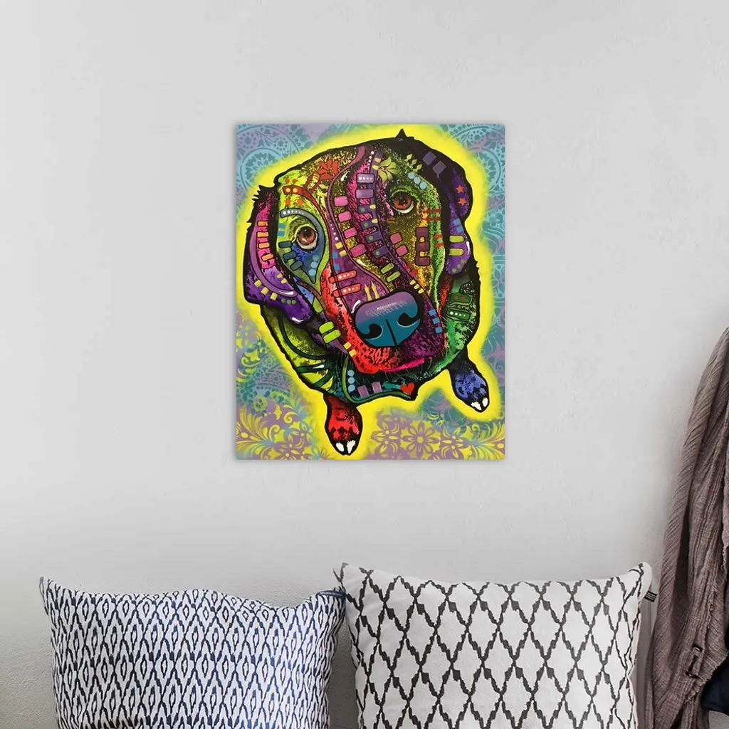 Contemporary stencil painting of a dog filled with various colors and patterns.