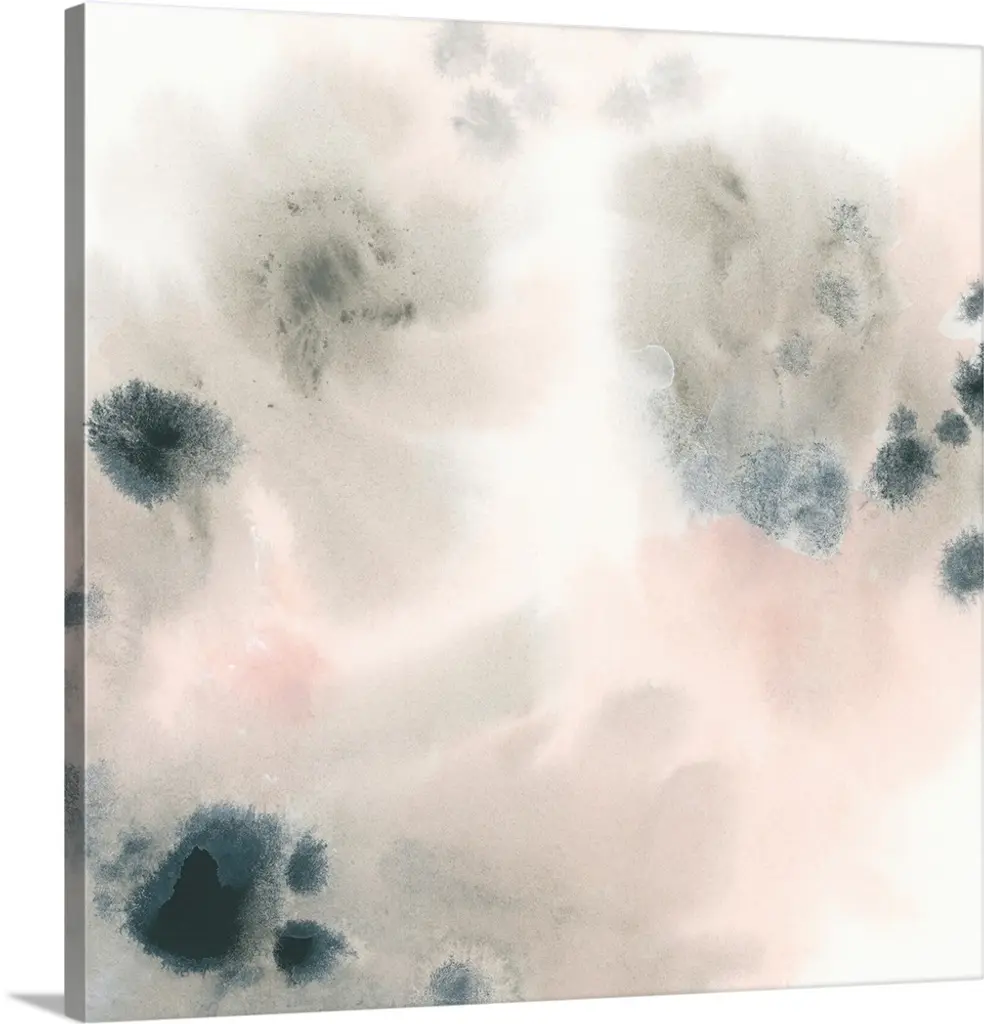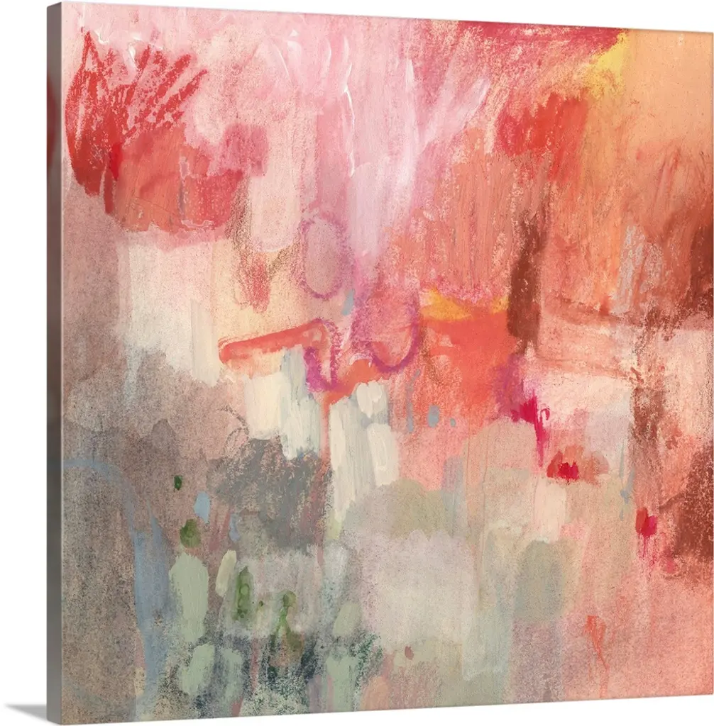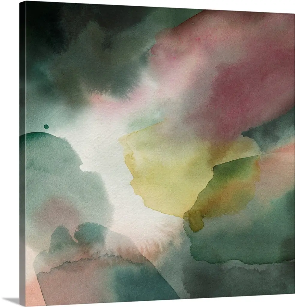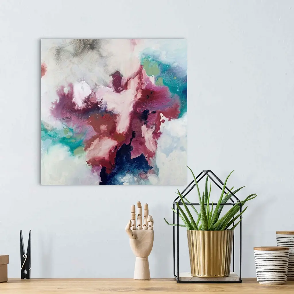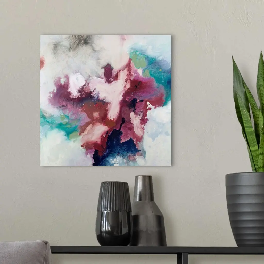 Square abstract painting with shades of blue, green, gray, and white with bold marsala hues pulling them all in to the center.