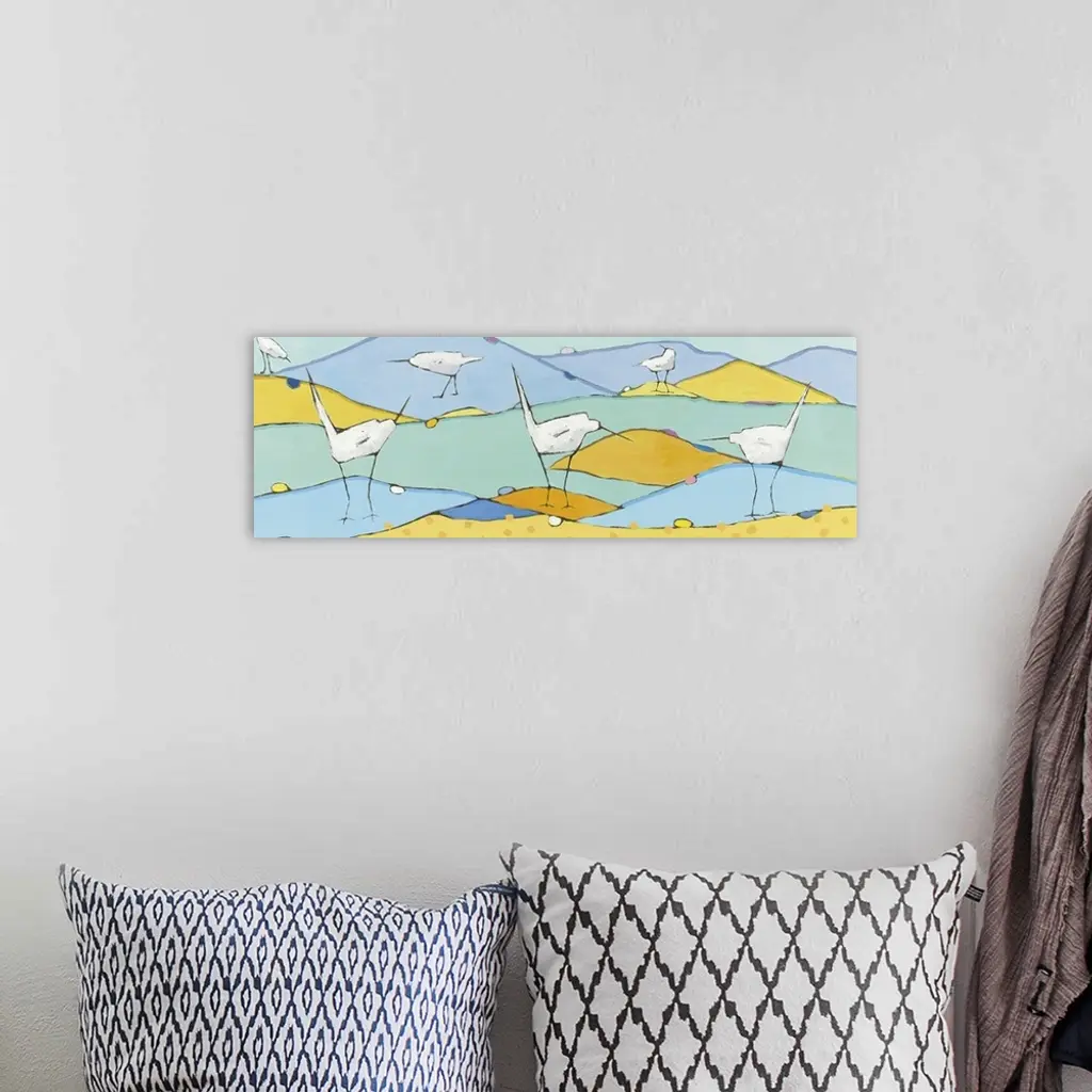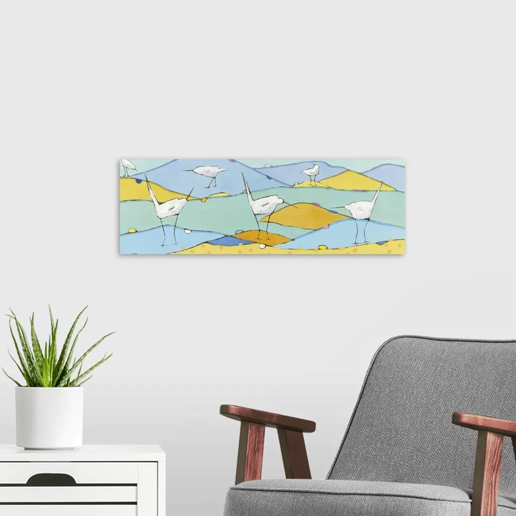 Long, horizontal abstract painting of six white egrets in a pastel colored marsh.