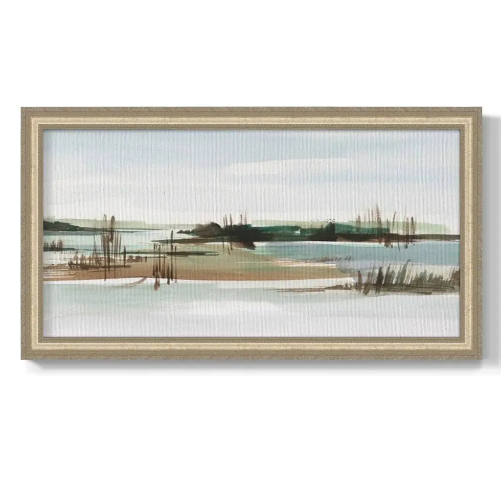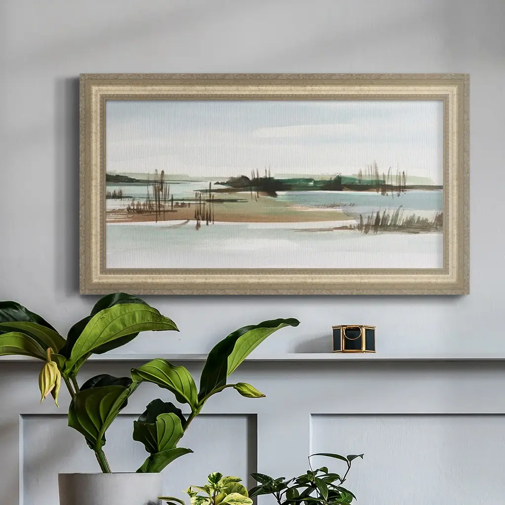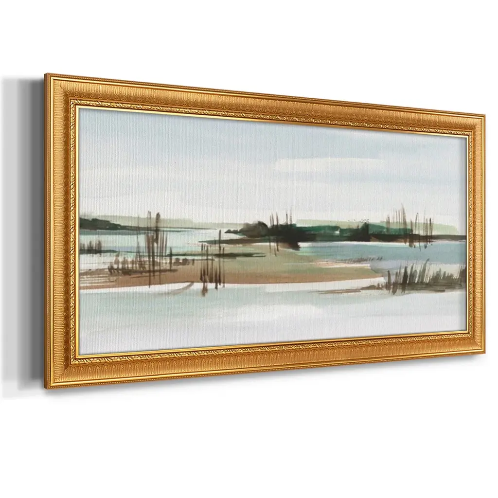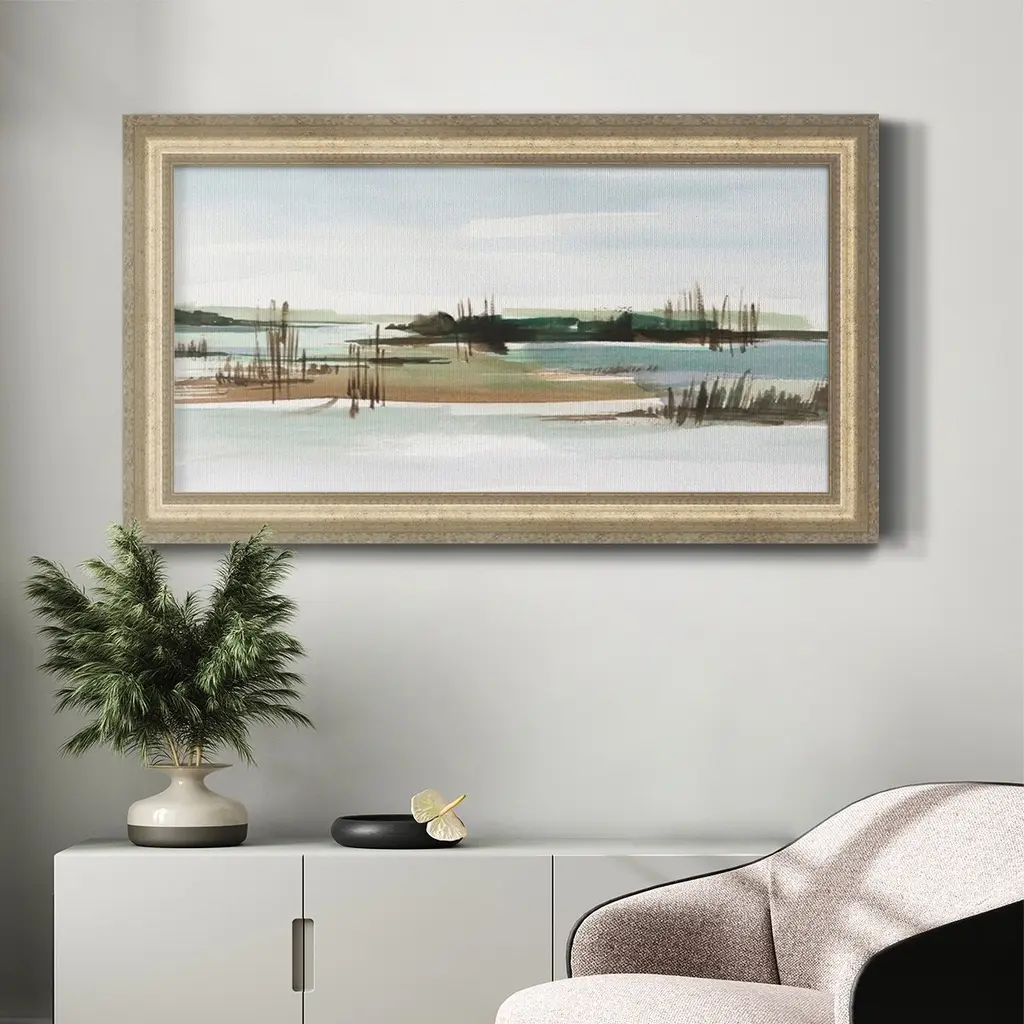 Marsh Reeds I Premium Framed Canvas- Ready to Hang A Premium Framed Canvas created to last. Framed in distressed wood and available in an array of sizes and colors Featuring a beveled a solid wood stretcher bar, each piece comes ready to hand 3 SIZES AVAILABLE 21''X37'' - Overall Size 25''X45'' - Overall Size 29''x53'' - Overall Size Each piece is made to order. Each piece comes with hanging hardware. Made in the USA Ready to Hang Giclee Paper Print Acrylic Glass Beveled Matt Board
