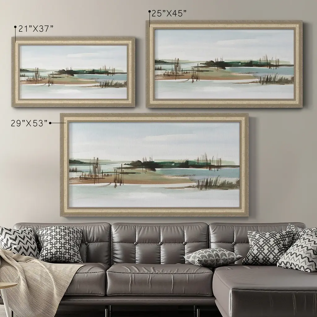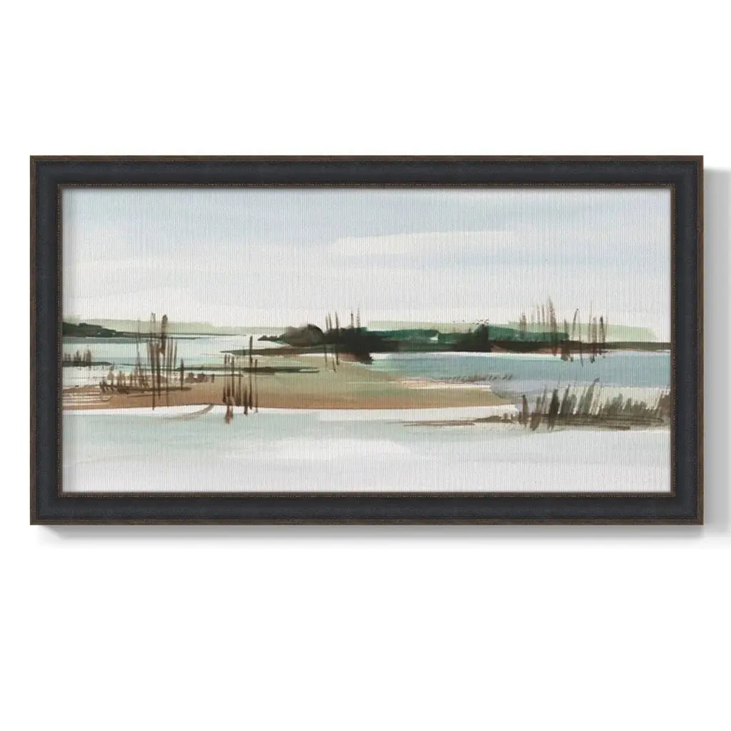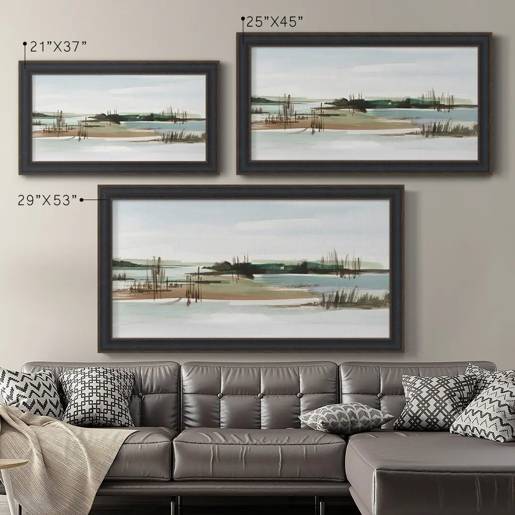 Marsh Reeds I Premium Framed Canvas- Ready to Hang A Premium Framed Canvas created to last. Framed in distressed wood and available in an array of sizes and colors Featuring a beveled a solid wood stretcher bar, each piece comes ready to hand 3 SIZES AVAILABLE 21''X37'' - Overall Size 25''X45'' - Overall Size 29''x53'' - Overall Size Each piece is made to order. Each piece comes with hanging hardware. Made in the USA Ready to Hang Giclee Paper Print Acrylic Glass Beveled Matt Board