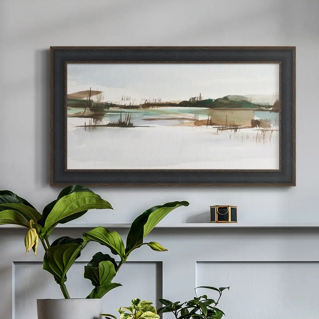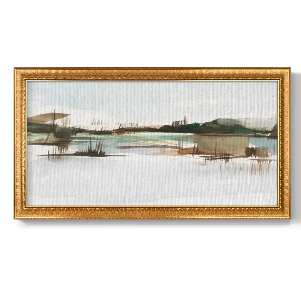 Marsh Reeds II Premium Framed Canvas- Ready to Hang A Premium Framed Canvas created to last. Framed in distressed wood and available in an array of sizes and colors Featuring a beveled a solid wood stretcher bar, each piece comes ready to hand 3 SIZES AVAILABLE 21''X37'' - Overall Size 25''X45'' - Overall Size 29''x53'' - Overall Size Each piece is made to order. Each piece comes with hanging hardware. Made in the USA Ready to Hang Giclee Paper Print Acrylic Glass Beveled Matt Board