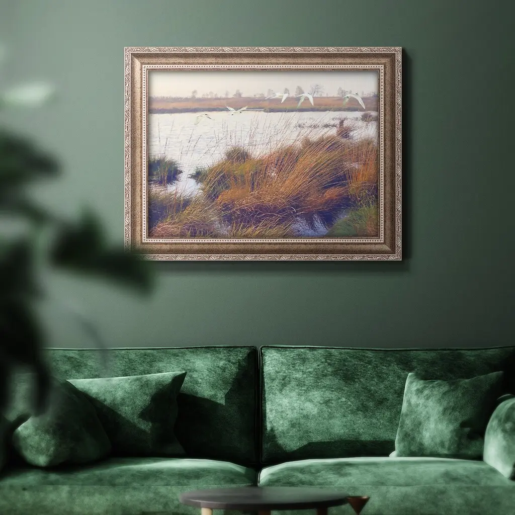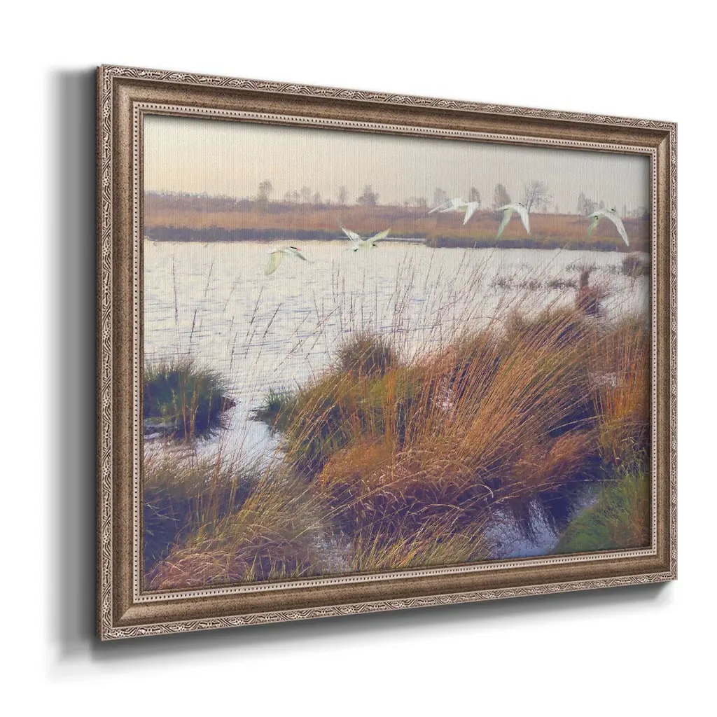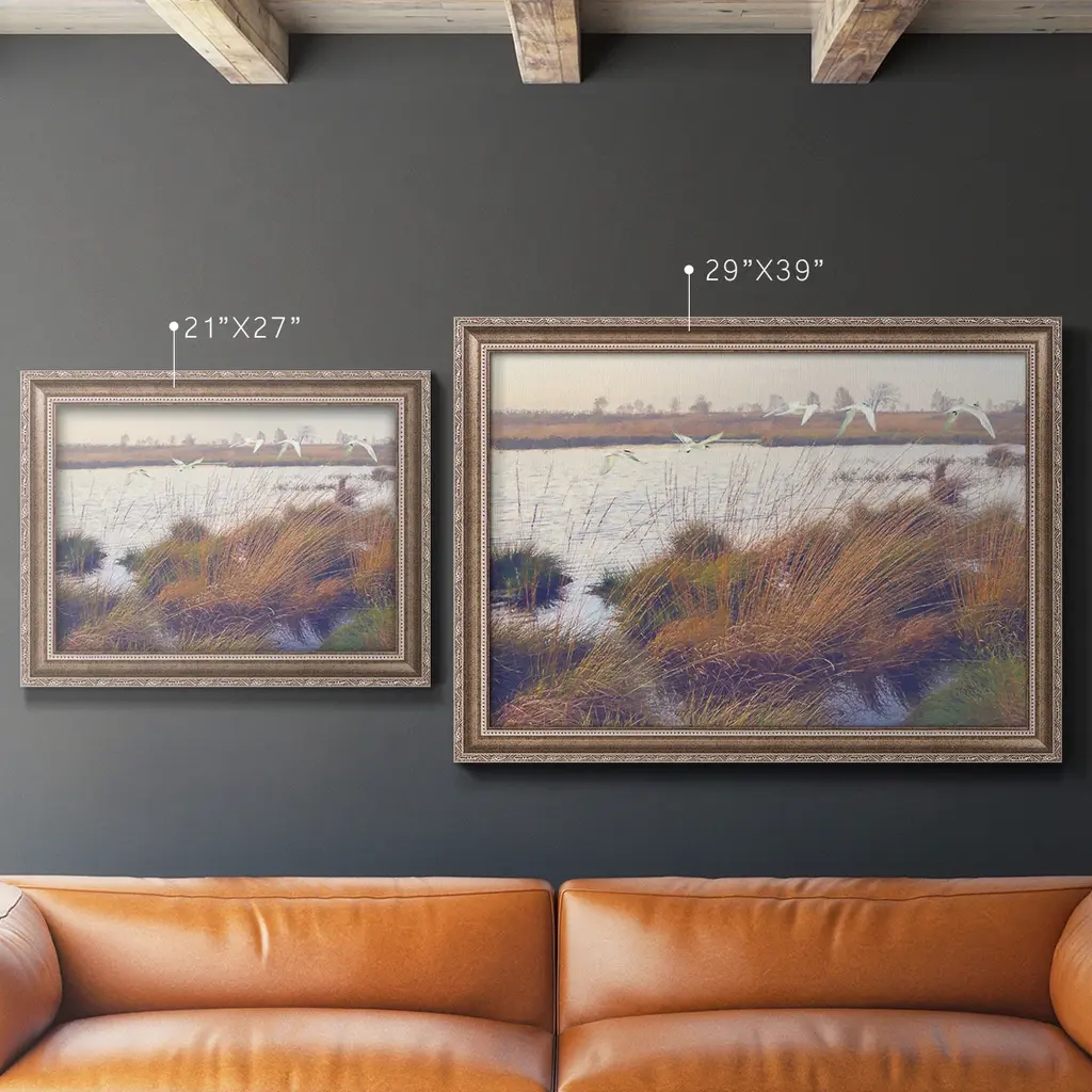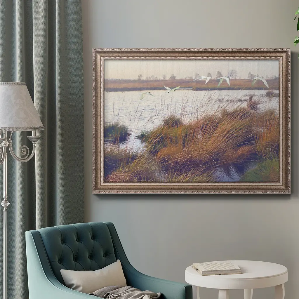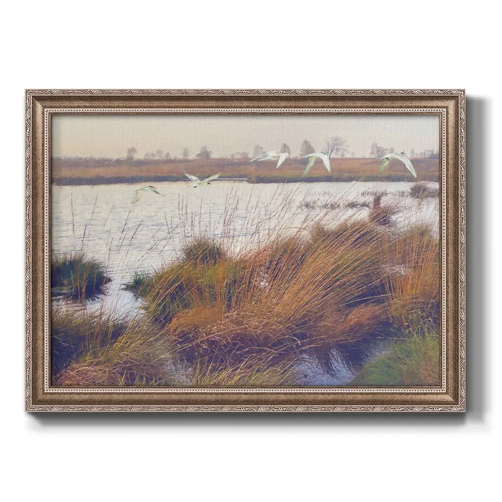 Marshland Hues I Premium Framed Canvas- Ready to Hang A Premium Framed Canvas created to last. Framed in distressed wood and available in an array of sizes and colors Featuring a beveled a solid wood stretcher bar, each piece comes ready to hand 3 SIZES AVAILABLE 16''X20'' - Overall Size 18'X27'' - Overall Size 24''x36'' - Overall Size Each piece is made to order. Each piece comes with hanging hardware. Made in the USA Ready to Hang Giclee Paper Print Acrylic Glass Beveled Matt Board