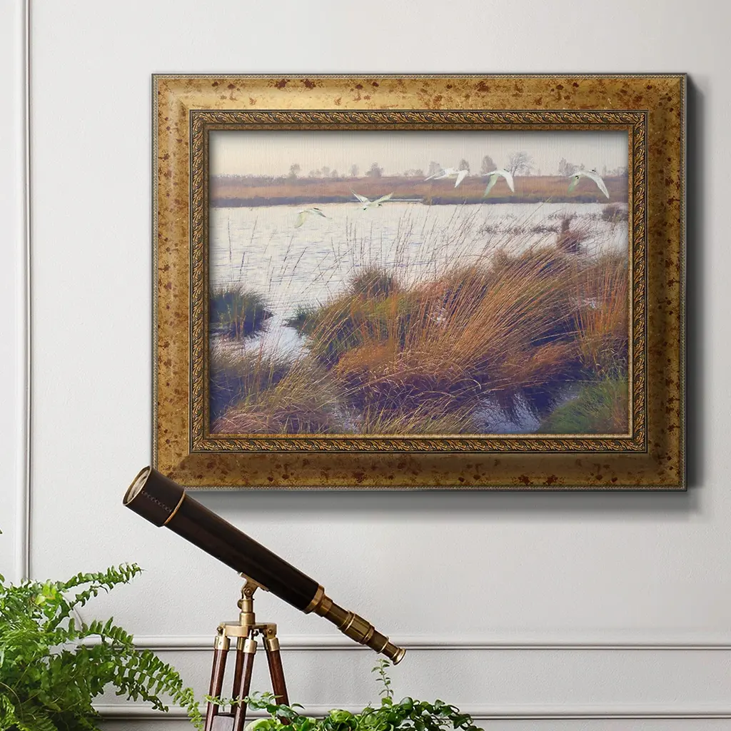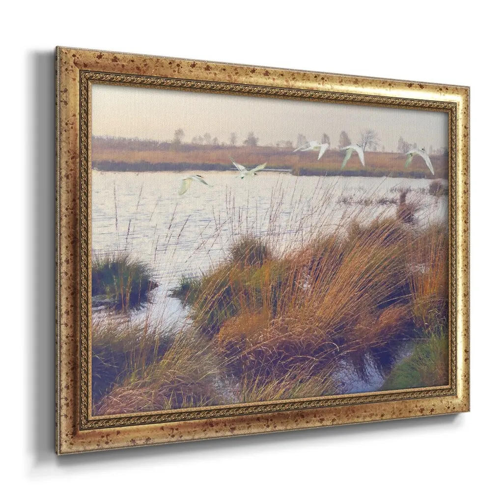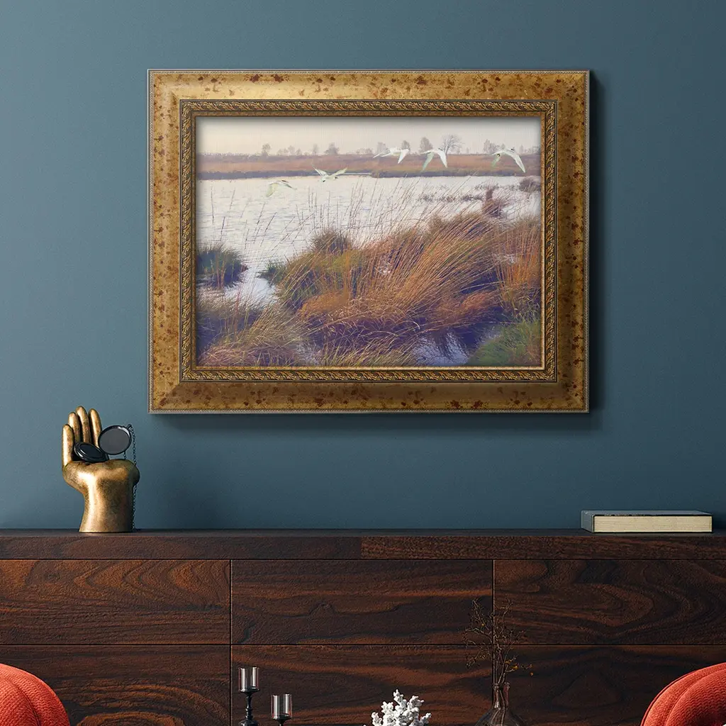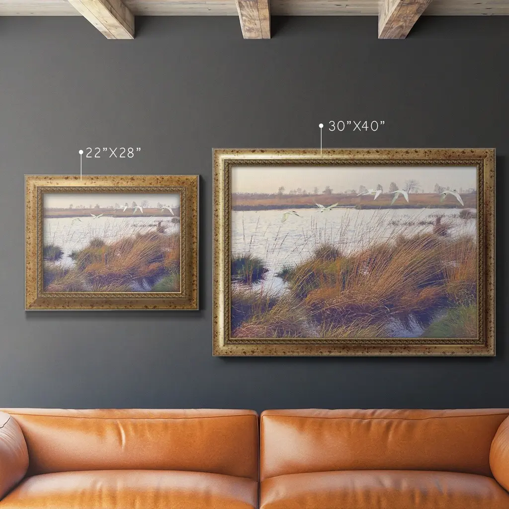 Marshland Hues I Premium Framed Canvas- Ready to Hang A Premium Framed Canvas created to last. Framed in distressed wood and available in an array of sizes and colors Featuring a beveled a solid wood stretcher bar, each piece comes ready to hand 3 SIZES AVAILABLE 16''X20'' - Overall Size 18'X27'' - Overall Size 24''x36'' - Overall Size Each piece is made to order. Each piece comes with hanging hardware. Made in the USA Ready to Hang Giclee Paper Print Acrylic Glass Beveled Matt Board
