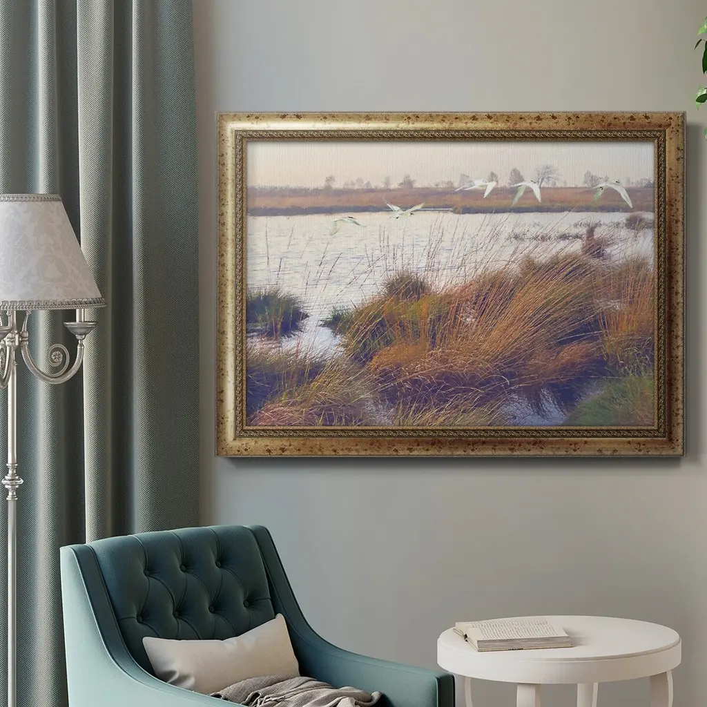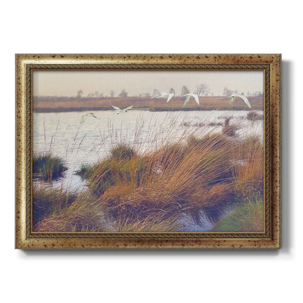 Marshland Hues I Premium Framed Canvas- Ready to Hang A Premium Framed Canvas created to last. Framed in distressed wood and available in an array of sizes and colors Featuring a beveled a solid wood stretcher bar, each piece comes ready to hand 3 SIZES AVAILABLE 16''X20'' - Overall Size 18'X27'' - Overall Size 24''x36'' - Overall Size Each piece is made to order. Each piece comes with hanging hardware. Made in the USA Ready to Hang Giclee Paper Print Acrylic Glass Beveled Matt Board