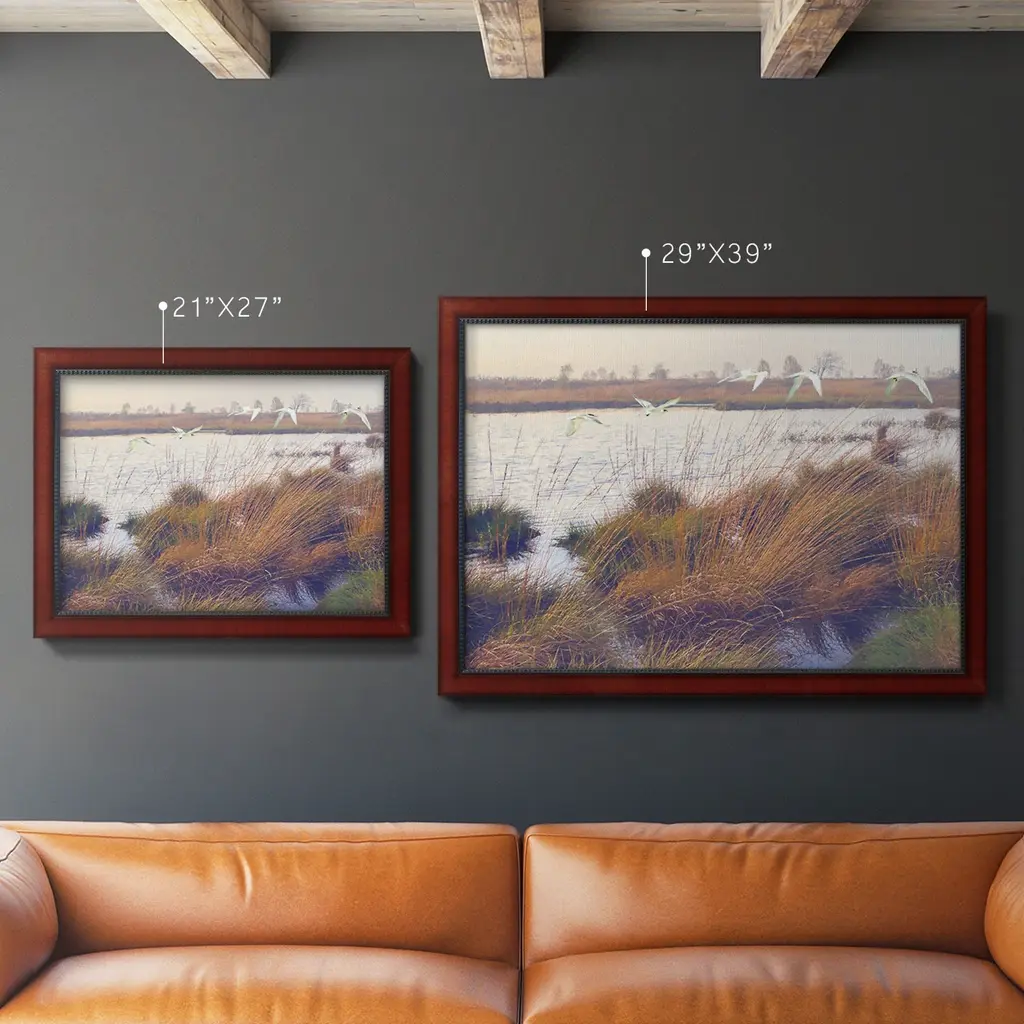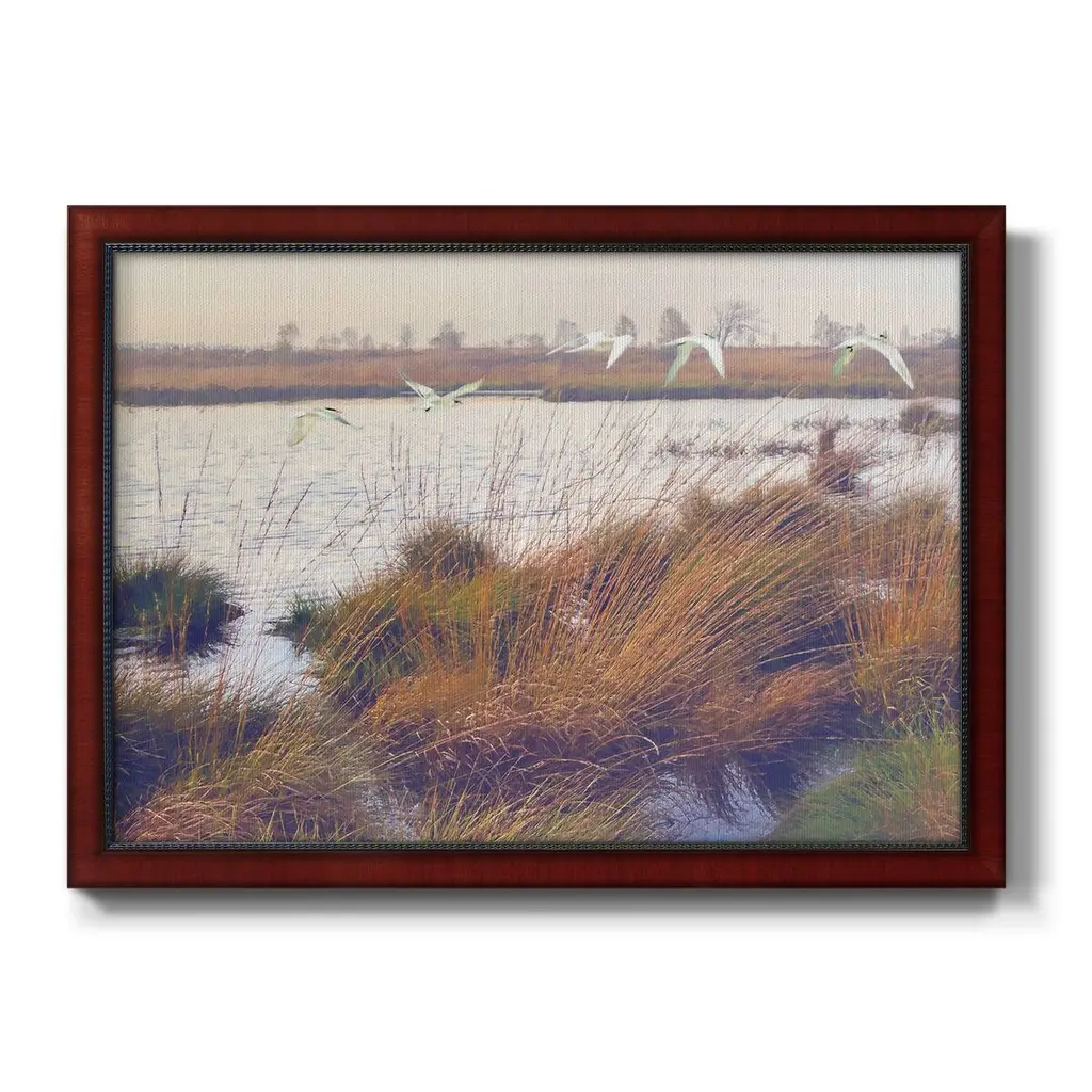 Marshland Hues I Premium Framed Canvas- Ready to Hang A Premium Framed Canvas created to last. Framed in distressed wood and available in an array of sizes and colors Featuring a beveled a solid wood stretcher bar, each piece comes ready to hand 3 SIZES AVAILABLE 16''X20'' - Overall Size 18'X27'' - Overall Size 24''x36'' - Overall Size Each piece is made to order. Each piece comes with hanging hardware. Made in the USA Ready to Hang Giclee Paper Print Acrylic Glass Beveled Matt Board