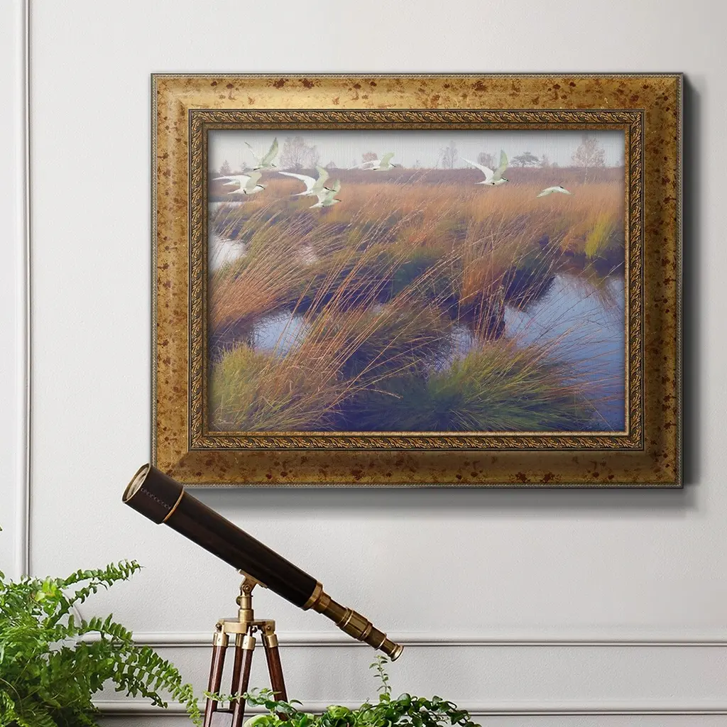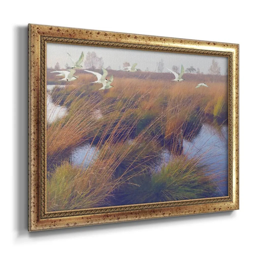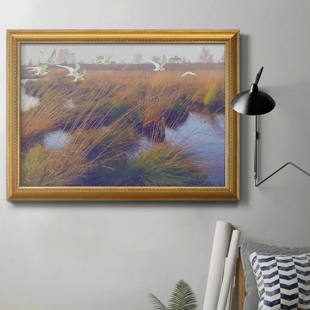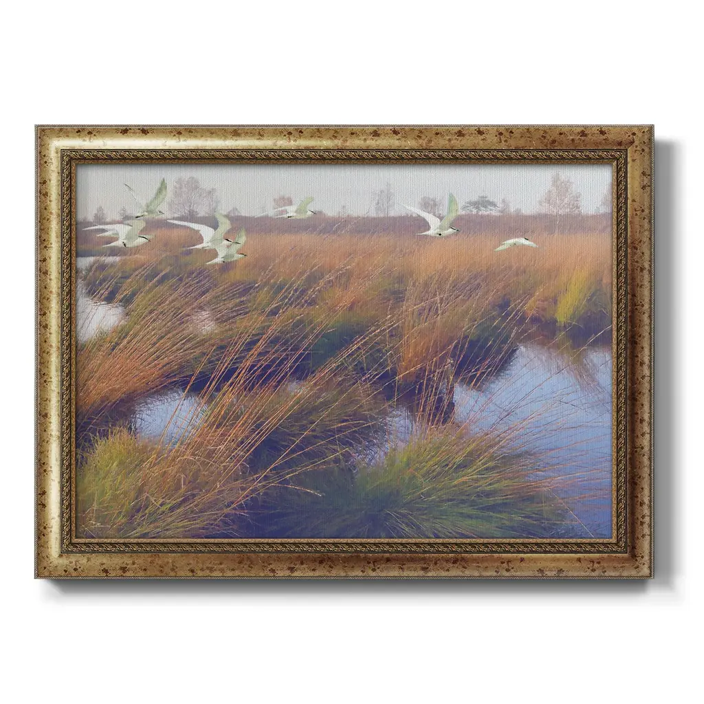 Marshland Hues II Premium Framed Canvas- Ready to Hang A Premium Framed Canvas created to last. Framed in distressed wood and available in an array of sizes and colors Featuring a beveled a solid wood stretcher bar, each piece comes ready to hand 3 SIZES AVAILABLE 16''X20'' - Overall Size 18'X27'' - Overall Size 24''x36'' - Overall Size Each piece is made to order. Each piece comes with hanging hardware. Made in the USA Ready to Hang Giclee Paper Print Acrylic Glass Beveled Matt Board