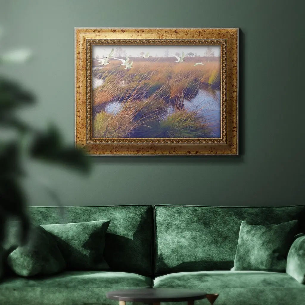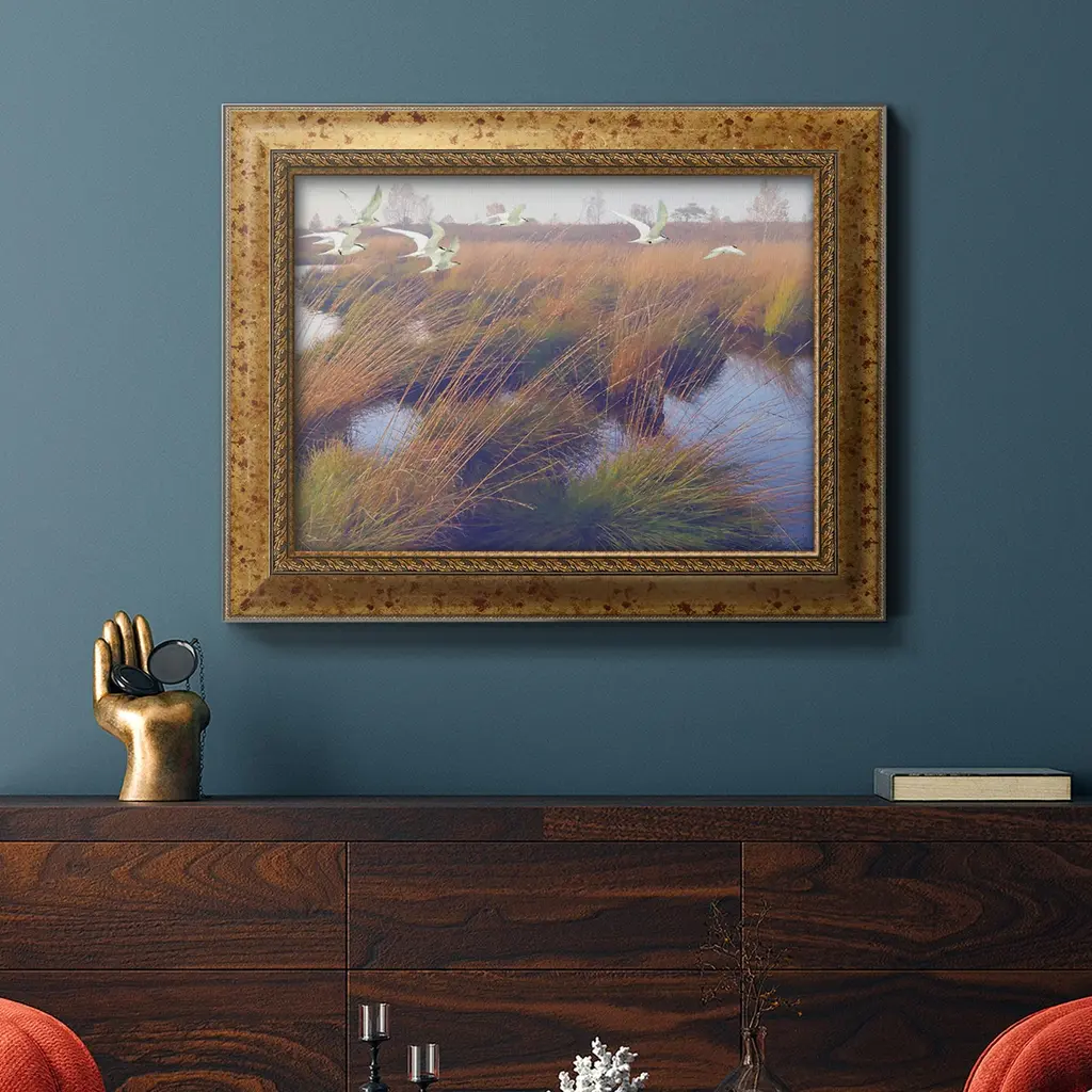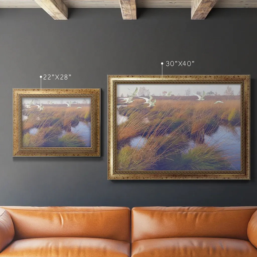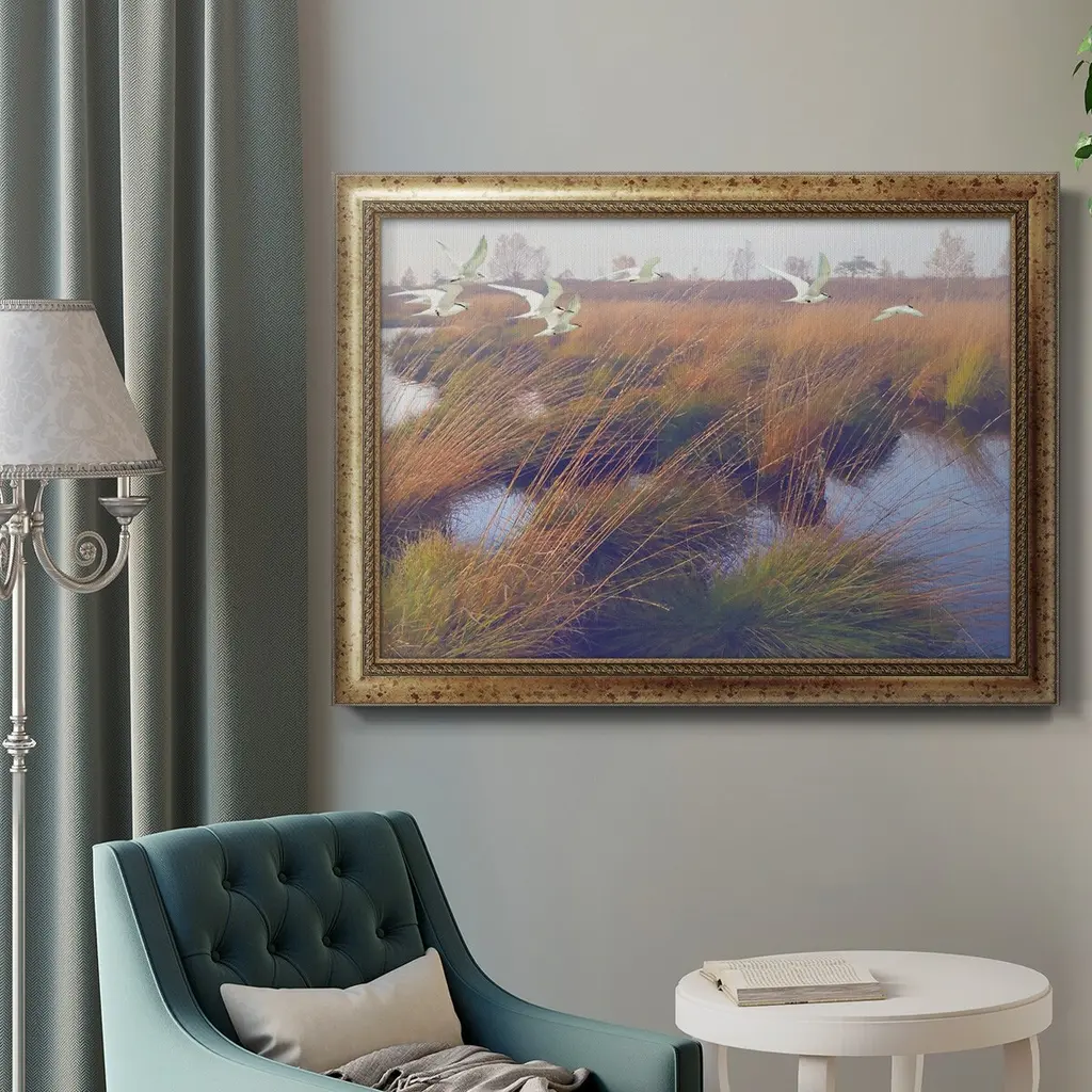 Marshland Hues II Premium Framed Canvas- Ready to Hang A Premium Framed Canvas created to last. Framed in distressed wood and available in an array of sizes and colors Featuring a beveled a solid wood stretcher bar, each piece comes ready to hand 3 SIZES AVAILABLE 16''X20'' - Overall Size 18'X27'' - Overall Size 24''x36'' - Overall Size Each piece is made to order. Each piece comes with hanging hardware. Made in the USA Ready to Hang Giclee Paper Print Acrylic Glass Beveled Matt Board
