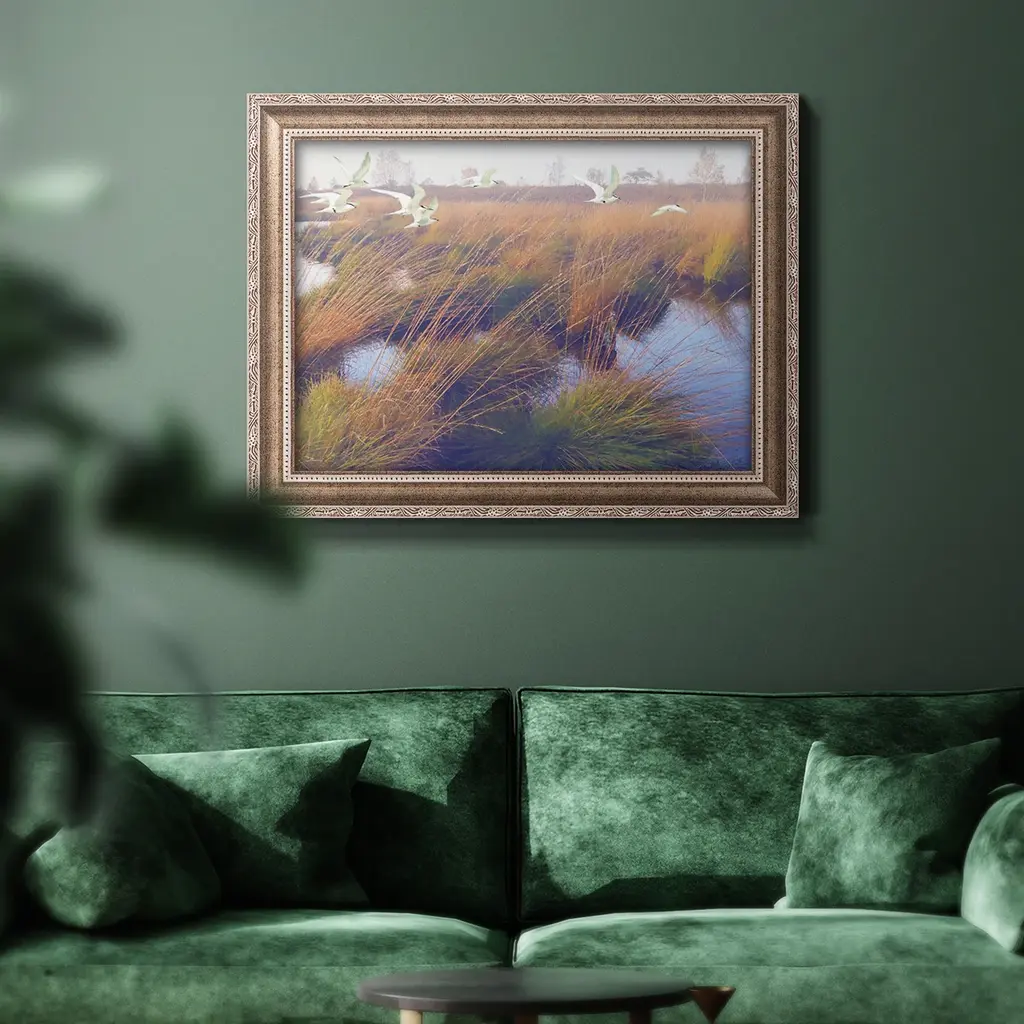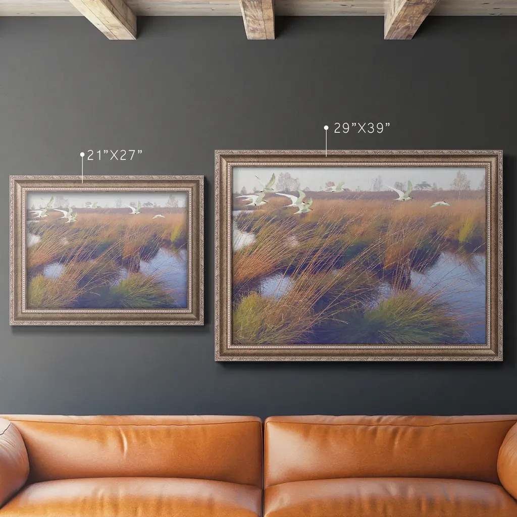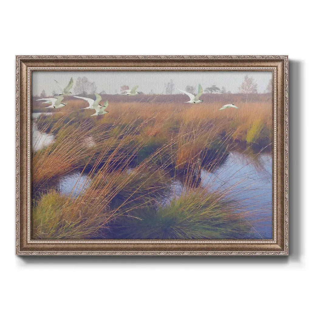 Marshland Hues II Premium Framed Canvas- Ready to Hang A Premium Framed Canvas created to last. Framed in distressed wood and available in an array of sizes and colors Featuring a beveled a solid wood stretcher bar, each piece comes ready to hand 3 SIZES AVAILABLE 16''X20'' - Overall Size 18'X27'' - Overall Size 24''x36'' - Overall Size Each piece is made to order. Each piece comes with hanging hardware. Made in the USA Ready to Hang Giclee Paper Print Acrylic Glass Beveled Matt Board