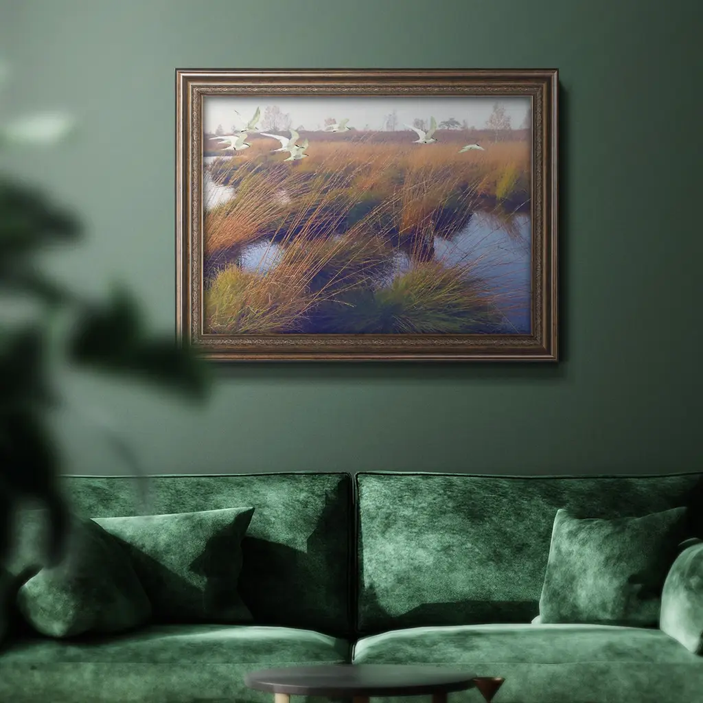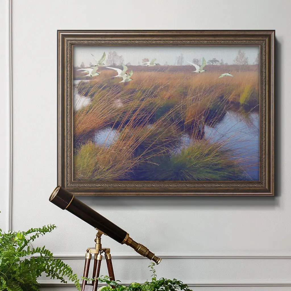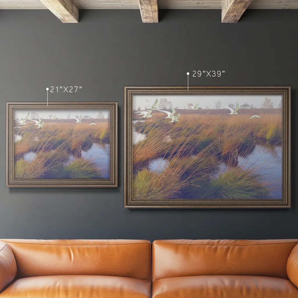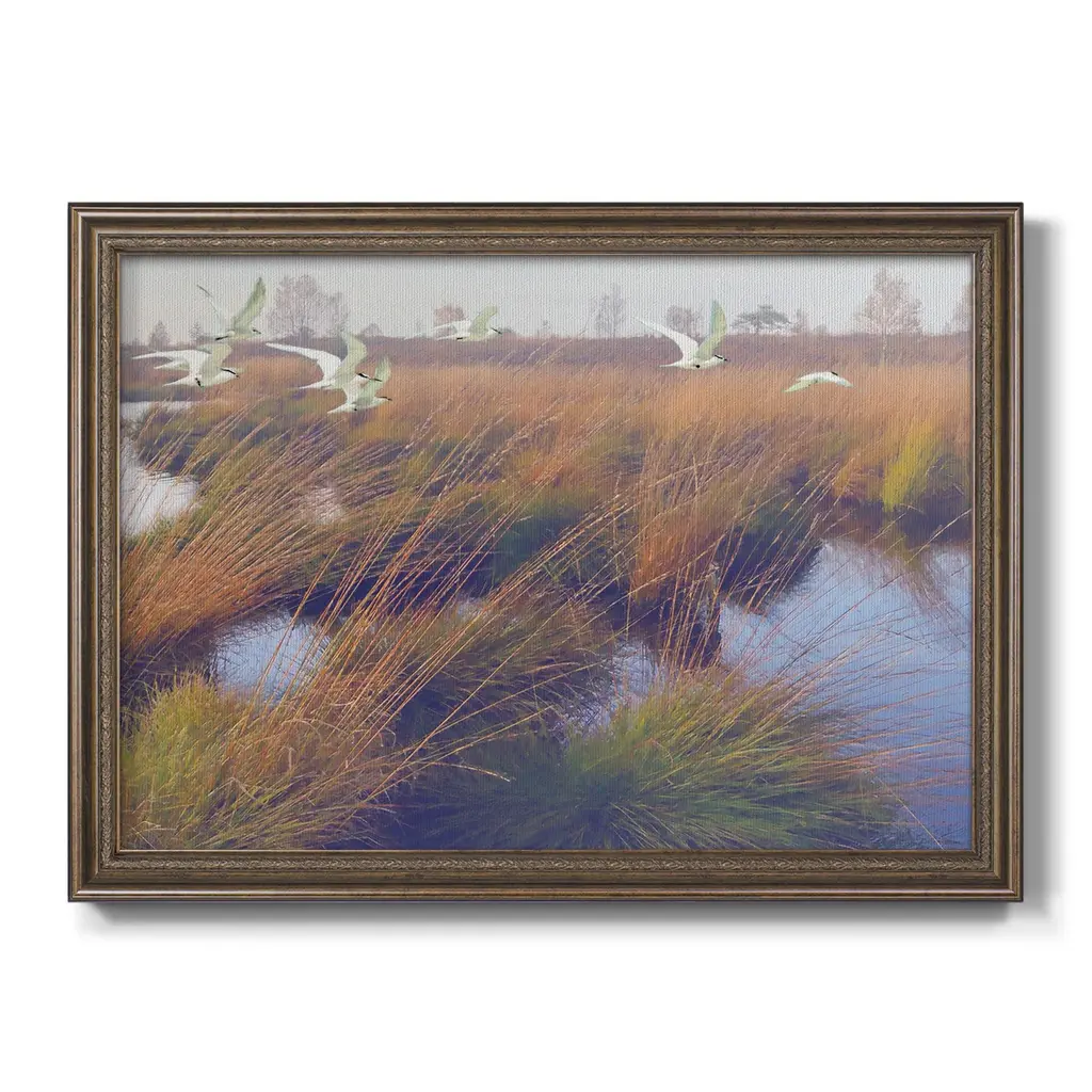 Marshland Hues II Premium Framed Canvas- Ready to Hang A Premium Framed Canvas created to last. Framed in distressed wood and available in an array of sizes and colors Featuring a beveled a solid wood stretcher bar, each piece comes ready to hand 3 SIZES AVAILABLE 16''X20'' - Overall Size 18'X27'' - Overall Size 24''x36'' - Overall Size Each piece is made to order. Each piece comes with hanging hardware. Made in the USA Ready to Hang Giclee Paper Print Acrylic Glass Beveled Matt Board