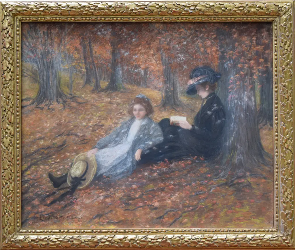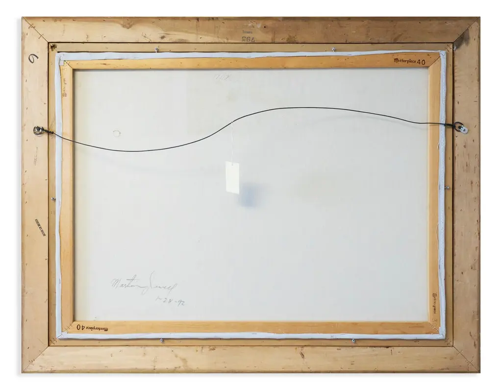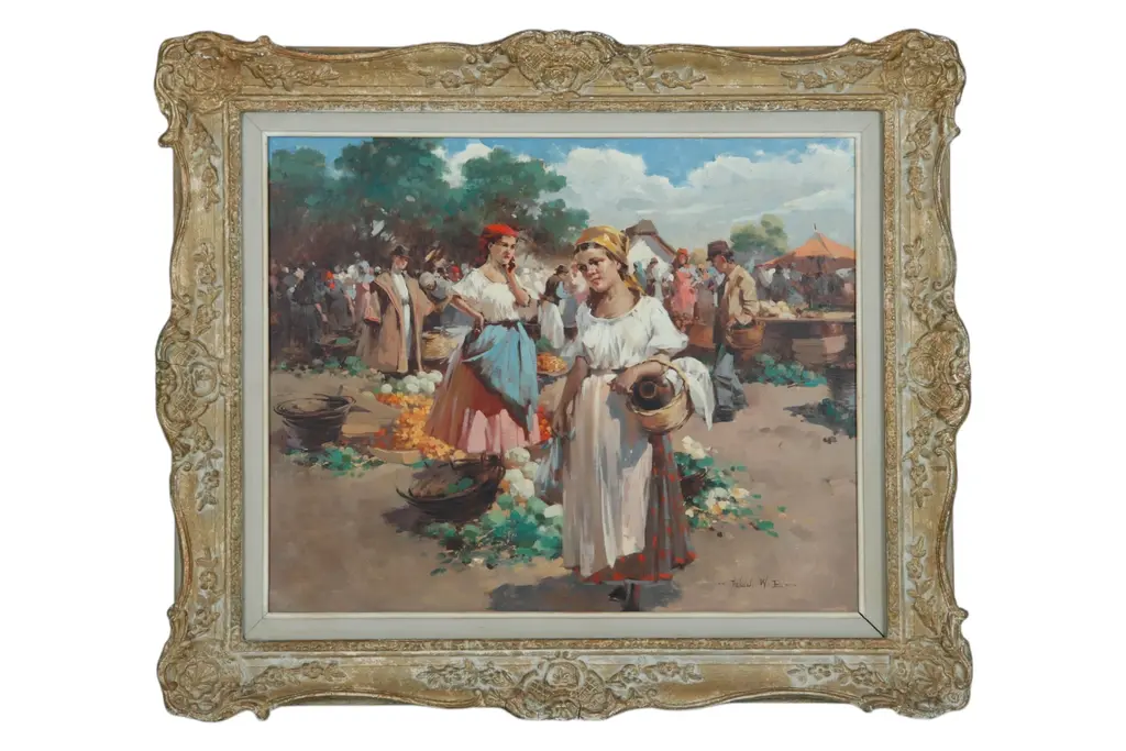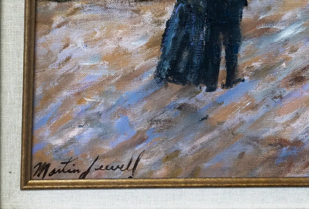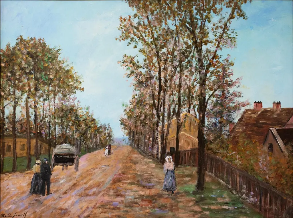 A contemporary Impressionist oil painting on canvas titled “On the Road to Rocquencourt” by Martin Jewell. Hand signed lower left and dated 1-28-92 on the verso. The composition features a nostalgic view of a quiet country lane in France with a richly textured Impressionist style. Tall trees with loosely rendered autumn foliage flank the road, guiding the viewer’s gaze into the distance where the lane disappears into a soft, hazy horizon. Scattered figures in period dress, a horse-drawn carriage, and quaint village houses add narrative charm and historical ambiance. Jewell’s use of dappled light and expressive brushwork evokes the influence of 19th-century French masters while maintaining his own romantic sensibility. The composition radiates serenity and timelessness, celebrating both nature and rural life. Provenance: From the collection of Northwood University in Midland, Michigan; proceeds of the sale will go towards the University’s endowment. Dimensions: 38”h x 47.5”w x 2”d (framed). In very good vintage condition. Full condition reports are available upon request. Martin Jewell (b. 1932) is a contemporary American artist recognized for his Impressionist-style oil paintings that capture idyllic landscapes and nostalgic rural scenes. Known for his vibrant brushwork and atmospheric depictions of nature, Jewell often draws inspiration from the French countryside and riverside villages. His paintings have been exhibited in regional galleries throughout the Midwest and have gained a following among collectors of traditional plein air and Impressionist-inspired art. Jewell’s works are praised for their timeless serenity and painterly technique, bridging classical influence with modern sensitivity.