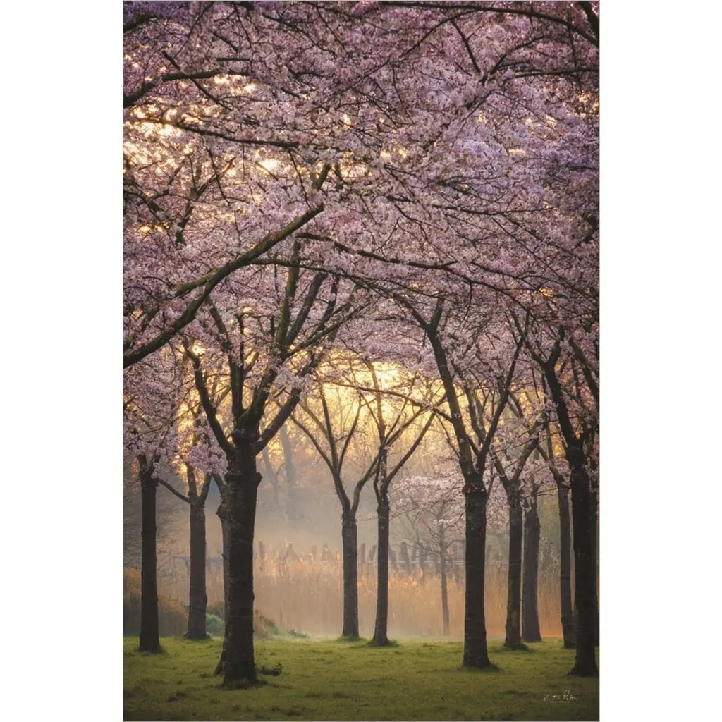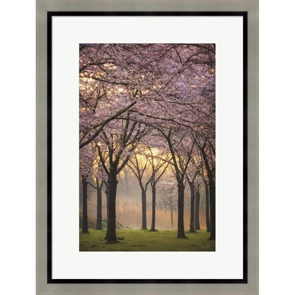 Cherry Trees at Sunrise by Martin Podt is a high quality piece of framed artwork. The finished size of this piece is 19" x 25.25". It has a Contemporary Silver Wood w/Black Inner Accent frame, White mat and is finished with high quality Acrylic Plexiglass. 100% Satisfaction Guaranteed.