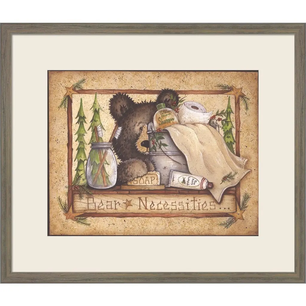 Bear Necessities by Mary Ann June is a high quality piece of framed artwork. The finished size of this piece is 20" X 17". It has a Distressed Grey Knotty Wood frame, is single matted and finished with high quality Acrylic Plexiglass. 100% Satisfaction Guaranteed.
