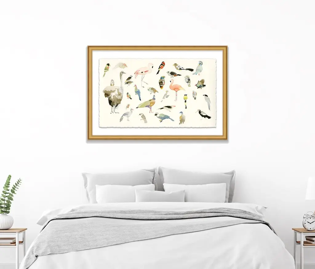 Exclusive to One Kings Lane: A stunning medley of birds from Mary H. Case is reproduced here on watercolor paper with deckled edges, floated over a white mat, and displayed in a wood frame. A lovely addition to any decor, this piece arrives ready to hang.