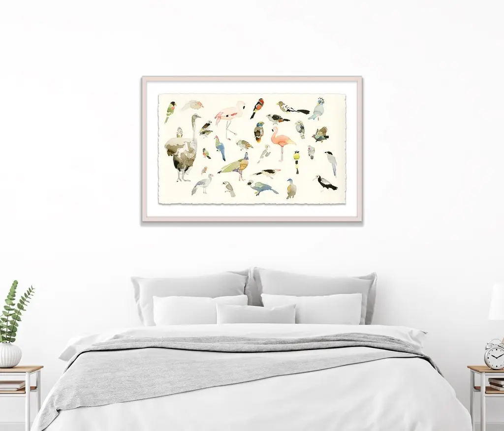 Exclusive to One Kings Lane: A stunning medley of birds from Mary H. Case is reproduced here on watercolor paper with deckled edges, floated over a white mat, and displayed in a wood frame. A lovely addition to any decor, this piece arrives ready to hang.