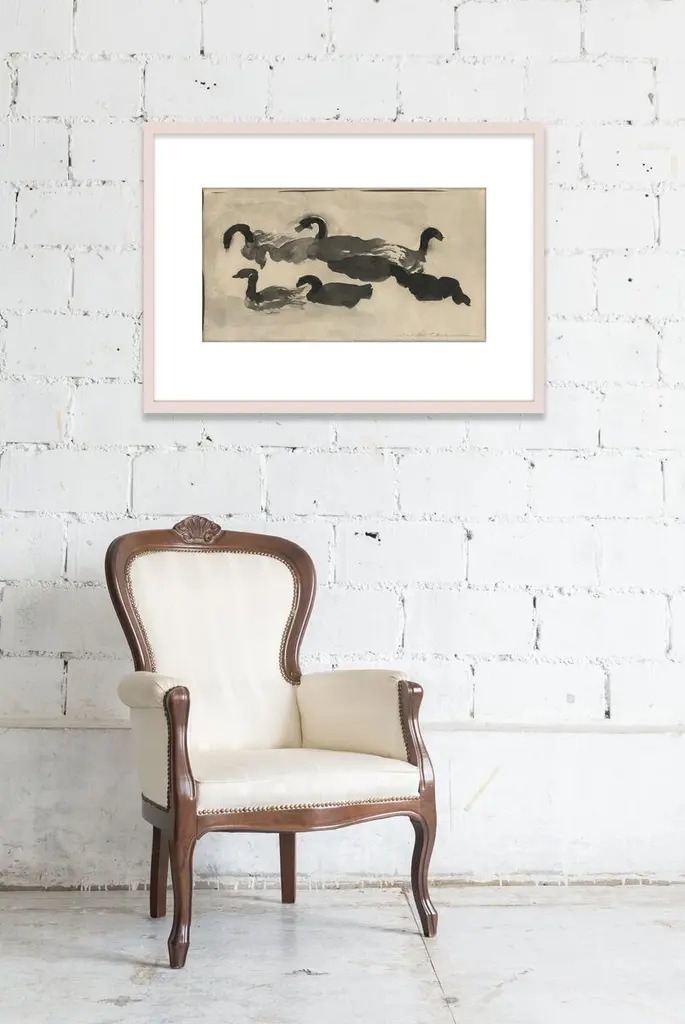 Exclusive to One Kings Lane: A drawing of geese from Mary H. Case is reproduced here on fine-art paper, matted, and displayed in a carved black frame. A lovely addition to any decor, this piece arrives ready to hang.
