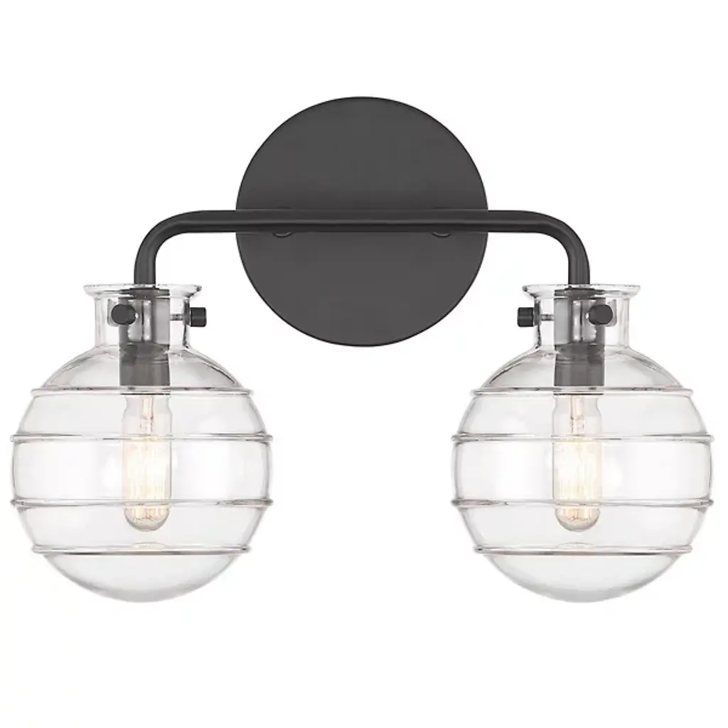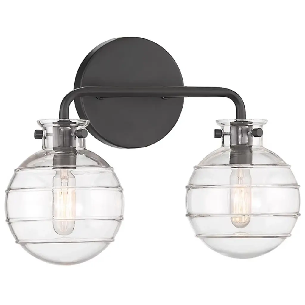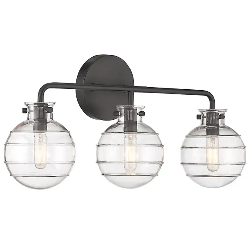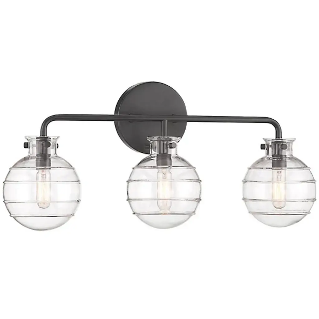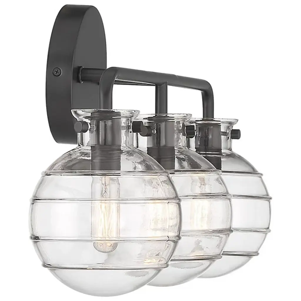 Brighten vanity spaces and more with the textured elegance of the Mason Vanity Light from Savoy House. Featuring spherical shades of clear swirl glass that extend gracefully around candelabra bulbs, this fixture adds an artistic twist to wall spaces. The rippled glass orbs become the stars of the show, echoing the round wall mount and adding an organic contrast to the streamlined metal framework. Damp-listed for versatile illumination, the light adds intriguing style to your sink space, pairing contemporary simplicity with a vintage vibe for a shimmering swirl of warm illumination.