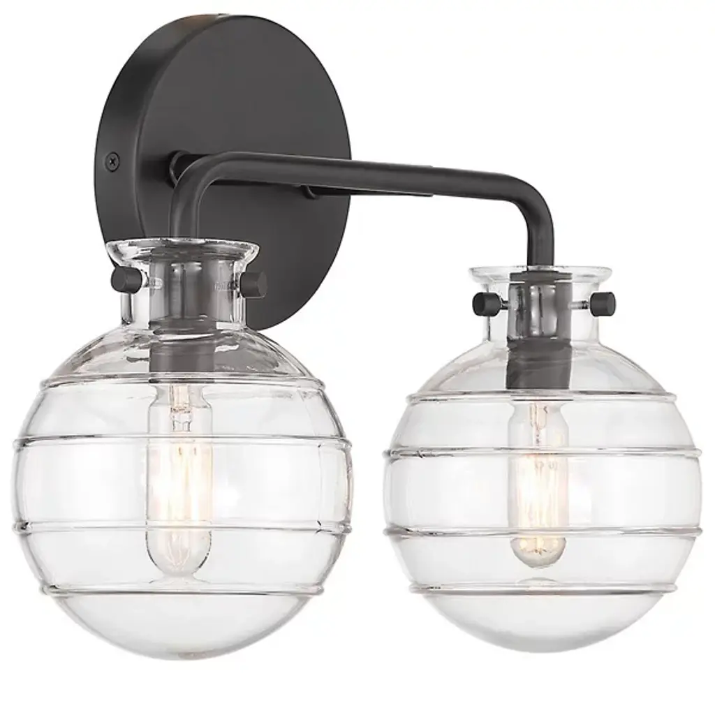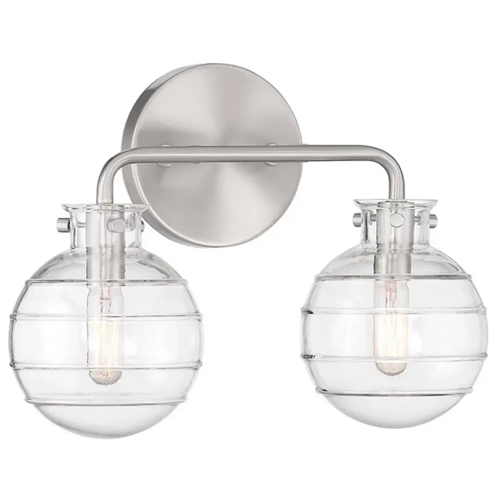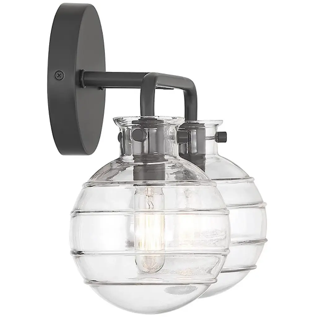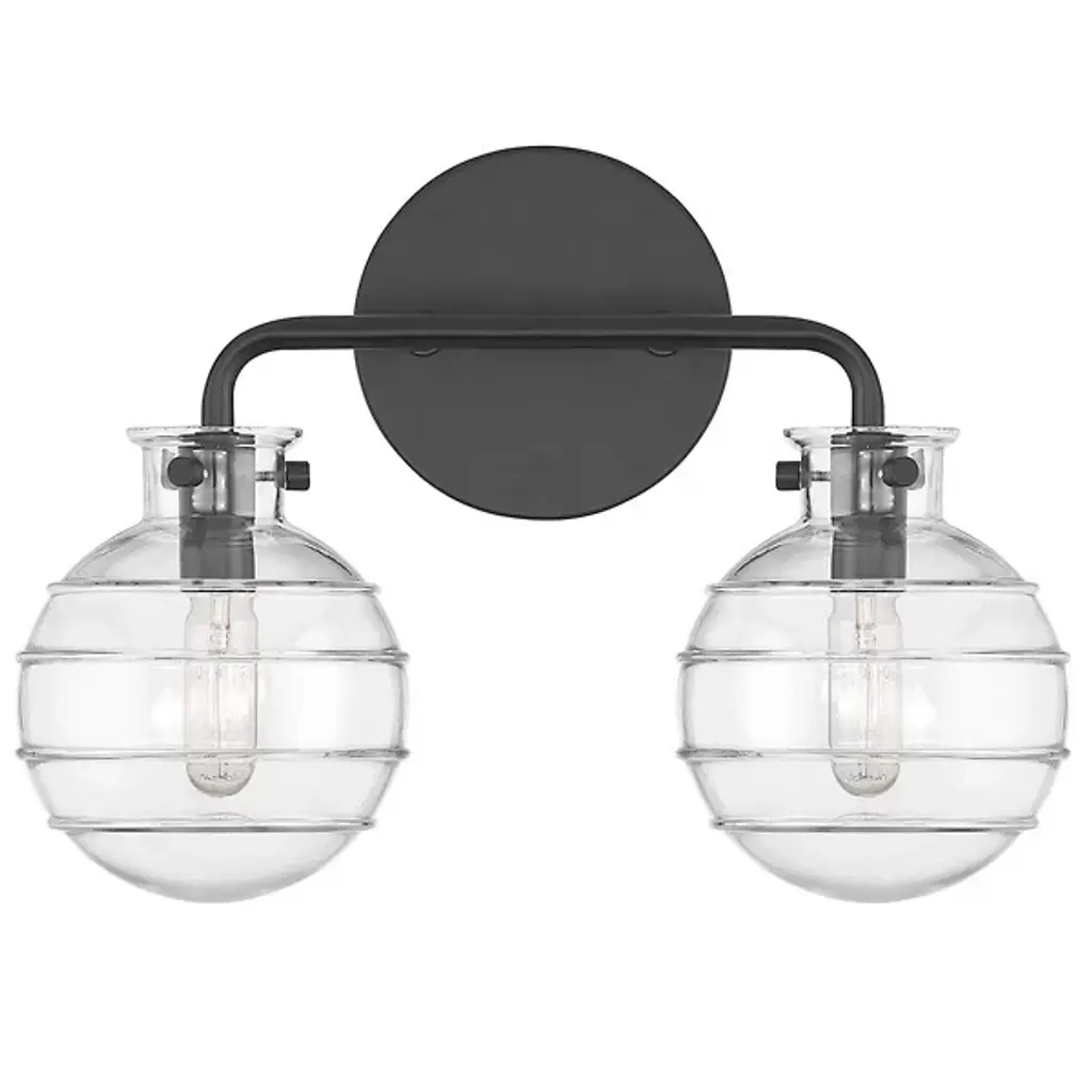 Brighten vanity spaces and more with the textured elegance of the Mason Vanity Light from Savoy House. Featuring spherical shades of clear swirl glass that extend gracefully around candelabra bulbs, this fixture adds an artistic twist to wall spaces. The rippled glass orbs become the stars of the show, echoing the round wall mount and adding an organic contrast to the streamlined metal framework. Damp-listed for versatile illumination, the light adds intriguing style to your sink space, pairing contemporary simplicity with a vintage vibe for a shimmering swirl of warm illumination.
