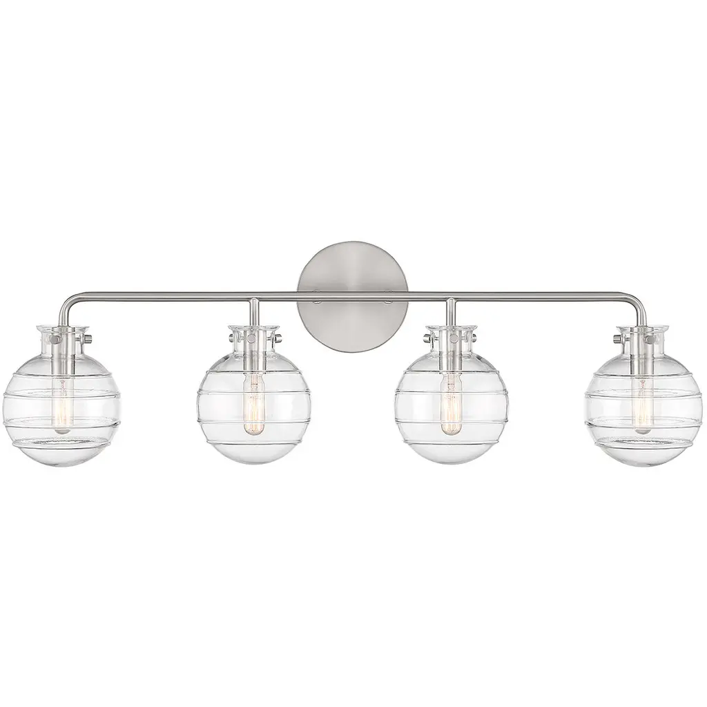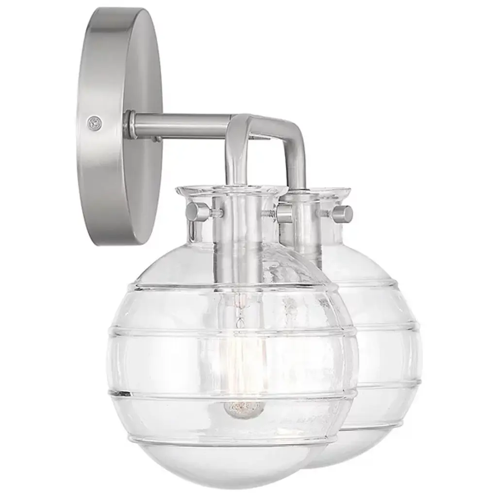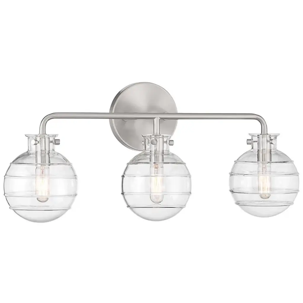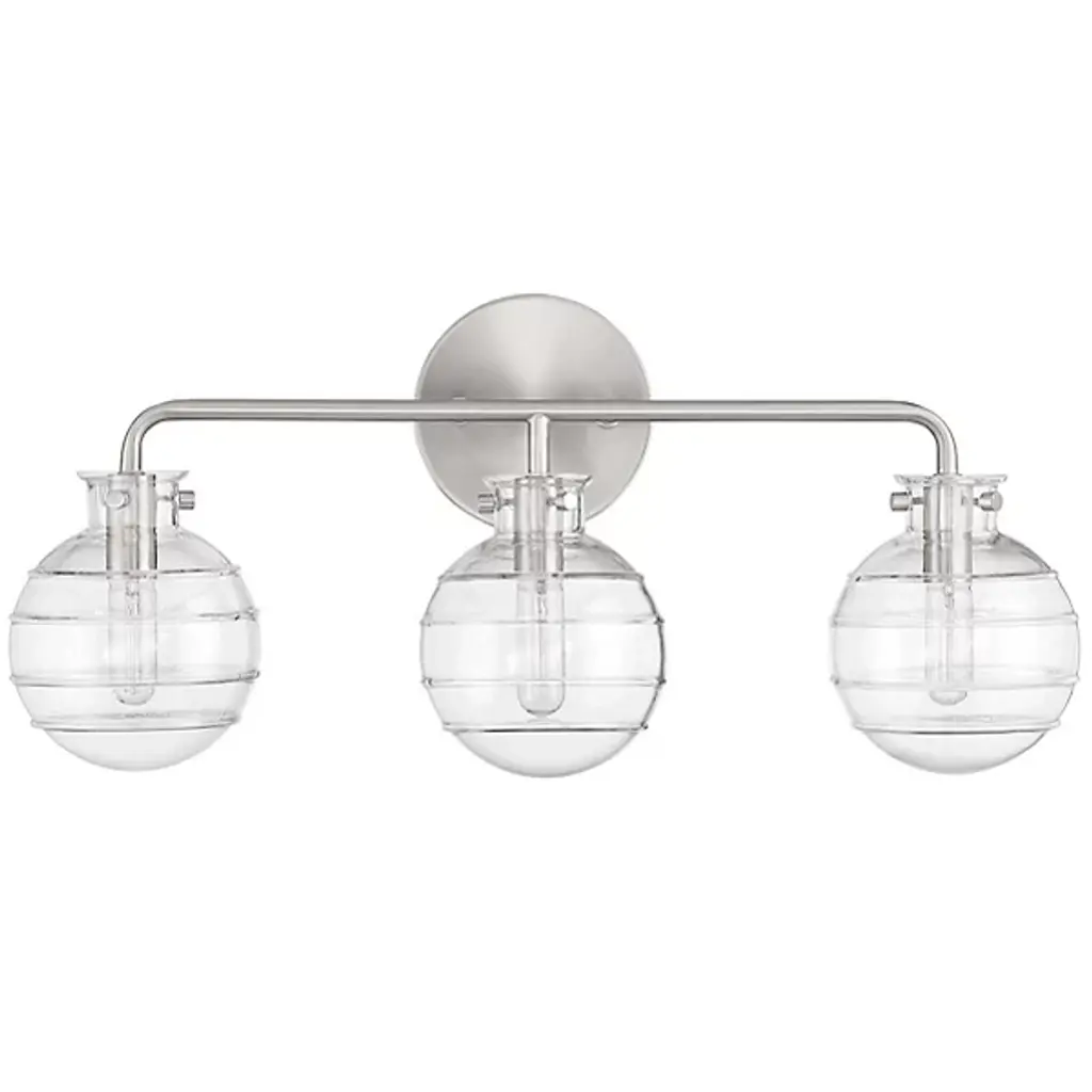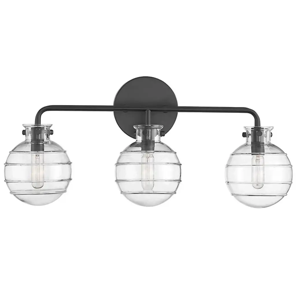 Brighten vanity spaces and more with the textured elegance of the Mason Vanity Light from Savoy House. Featuring spherical shades of clear swirl glass that extend gracefully around candelabra bulbs, this fixture adds an artistic twist to wall spaces. The rippled glass orbs become the stars of the show, echoing the round wall mount and adding an organic contrast to the streamlined metal framework. Damp-listed for versatile illumination, the light adds intriguing style to your sink space, pairing contemporary simplicity with a vintage vibe for a shimmering swirl of warm illumination.