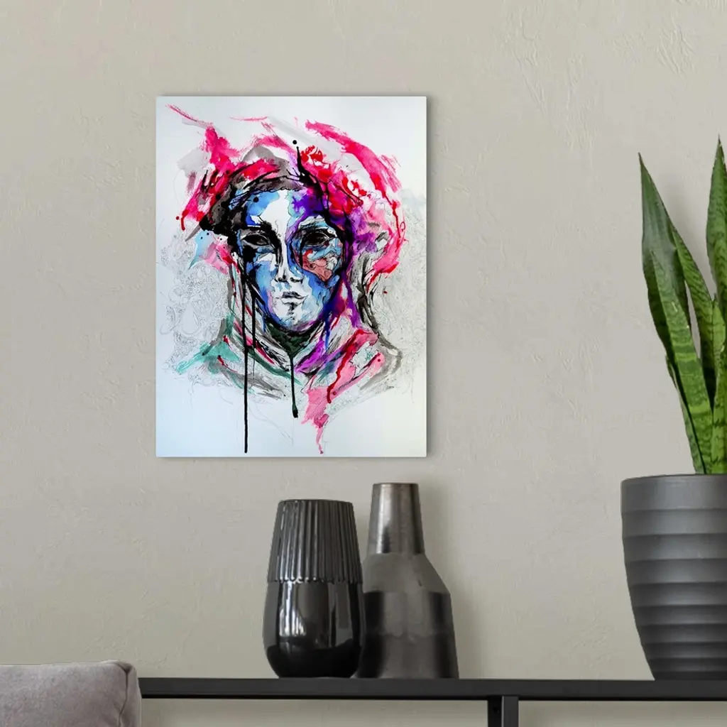 Watercolor and ink painting of a person wearing a masquerade mask.