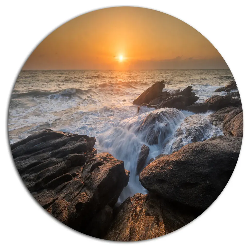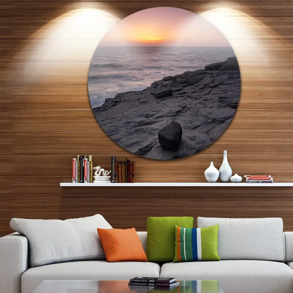 Bring Contemporary Abstraction to your home with this large Circle Metal wall art. This Massive Rock on Beach Magoito Sintra Metal Artwork makes it the focal point of any room or office. - White Gloss Coating ensures colors are extra vibrant with light reflection.- Aluminum grade Sheet Metal with 1 inch mounting frame on the back giving the illusion that the artwork is floating on the wall..- Mounting Brackets are included along with instructions.- High Quality Digital images are created directly into a glossy aluminum panel producing a stunning and captivating print into the glossy finish of the metal.- Water, Fire and Scratch resistant HD Aluminum panels.- Looks better than any photo paper and guaranteed to last at least 20 years- Easy to clean with a microfiber cloth. Colors are far superior to regular Canvas Art. - Easy to Hang